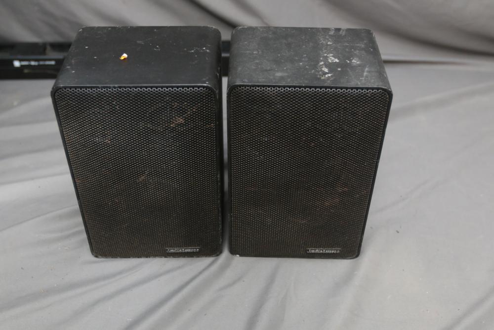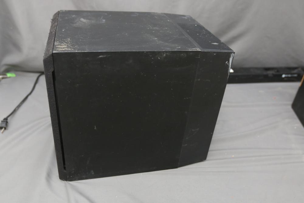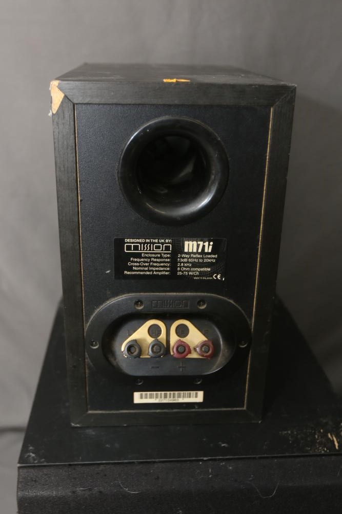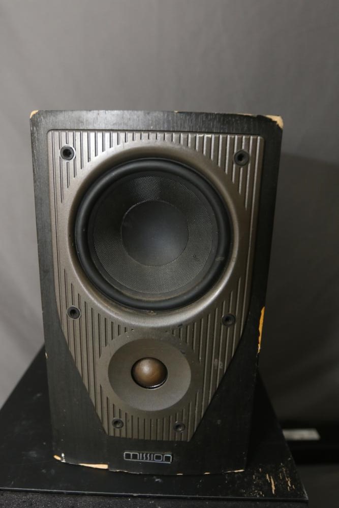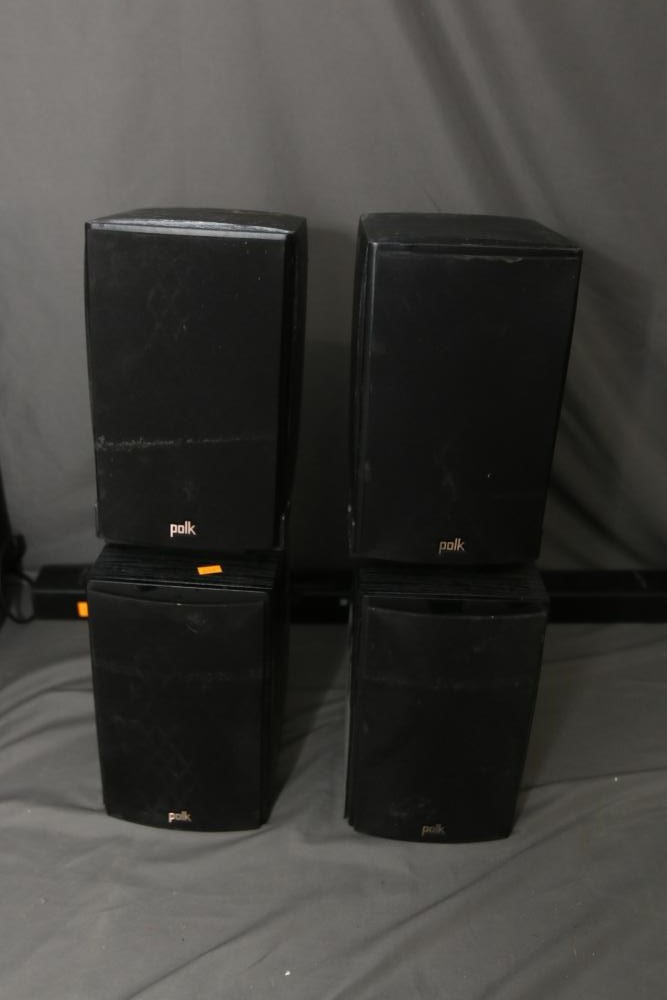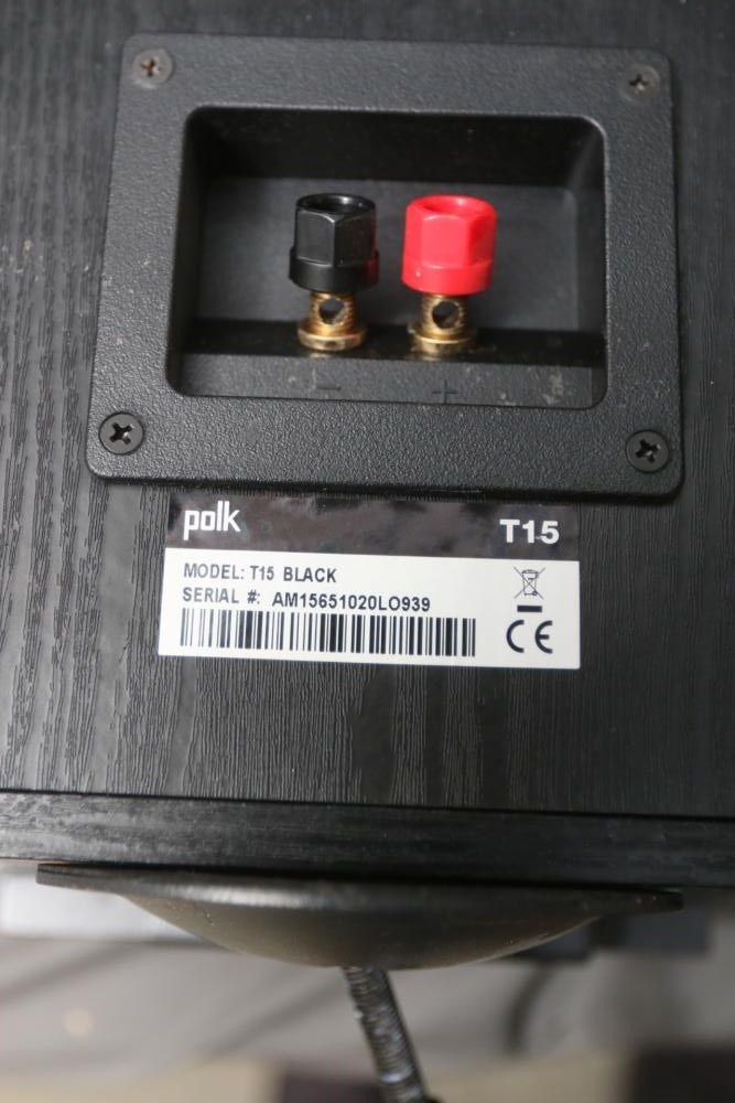 Home audio speakers incl Samsung sound bar model HW-KM45, two AudioSource acoustic suspension speakers model LS-THREE, four Polk Audio speakers model T15 BLACK, Mission M71i, and Sony active subwoofer model SA-CS9. Pickup only.