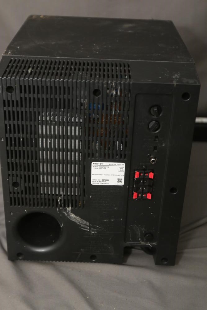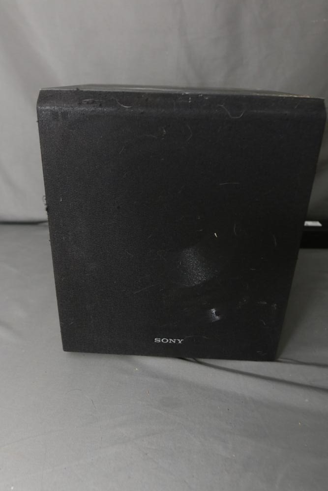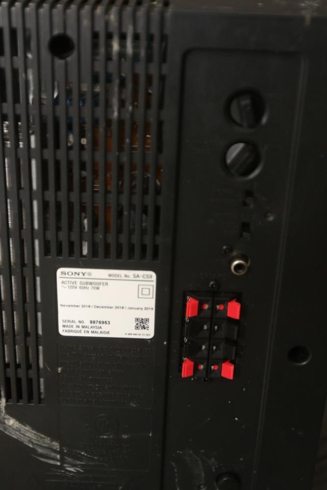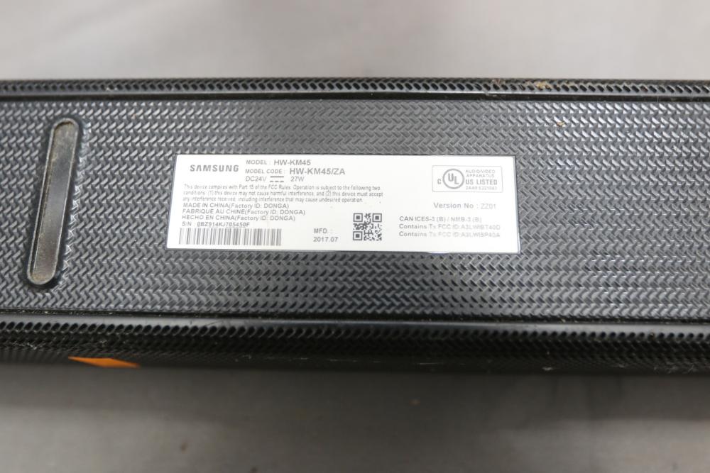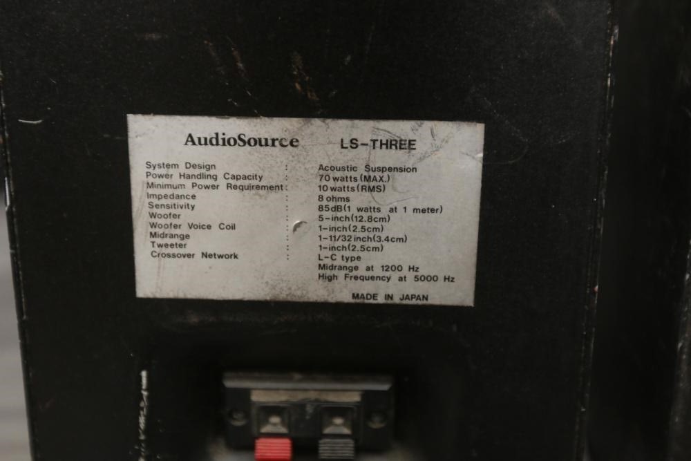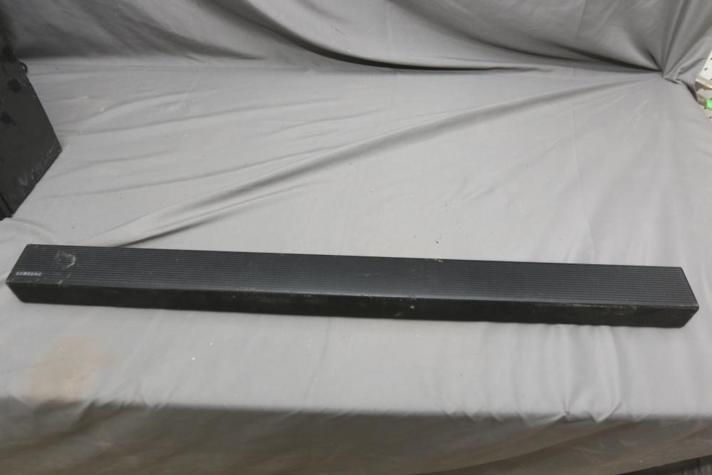 Home audio speakers incl Samsung sound bar model HW-KM45, two AudioSource acoustic suspension speakers model LS-THREE, four Polk Audio speakers model T15 BLACK, Mission M71i, and Sony active subwoofer model SA-CS9. Pickup only.