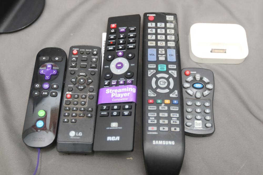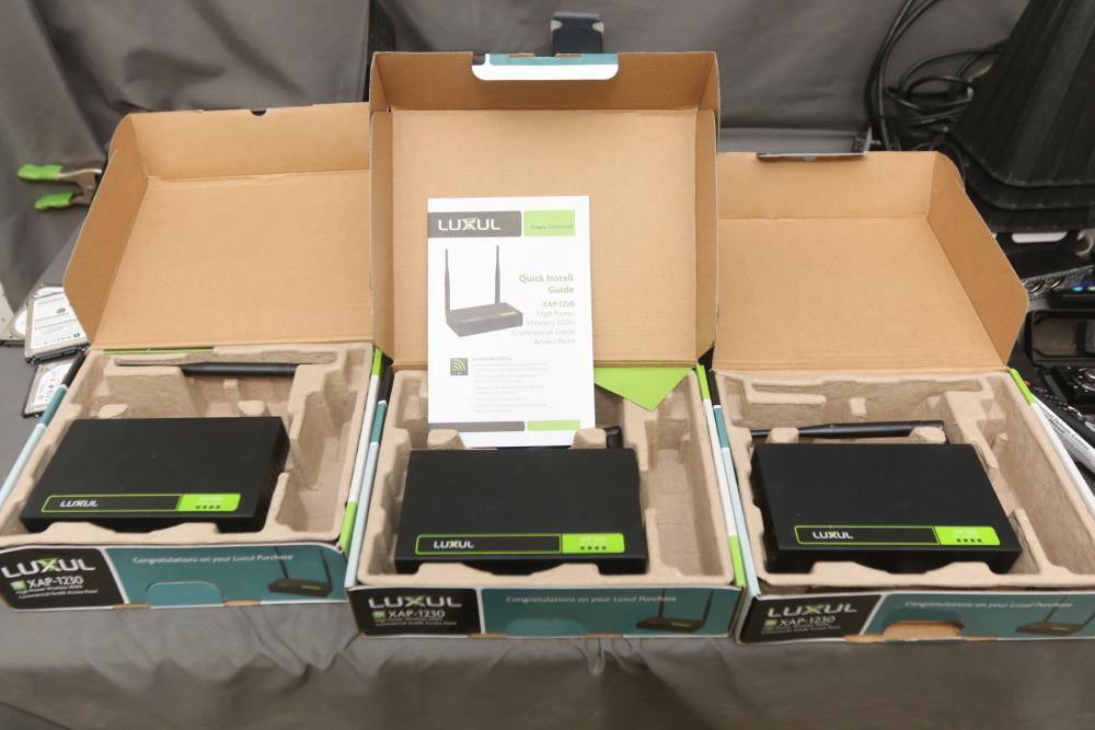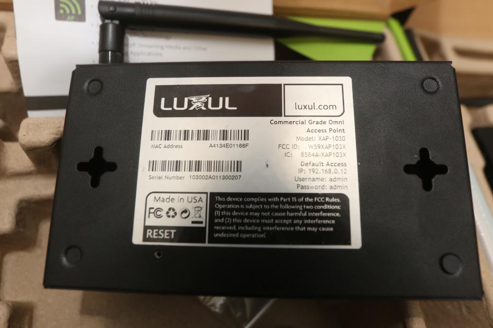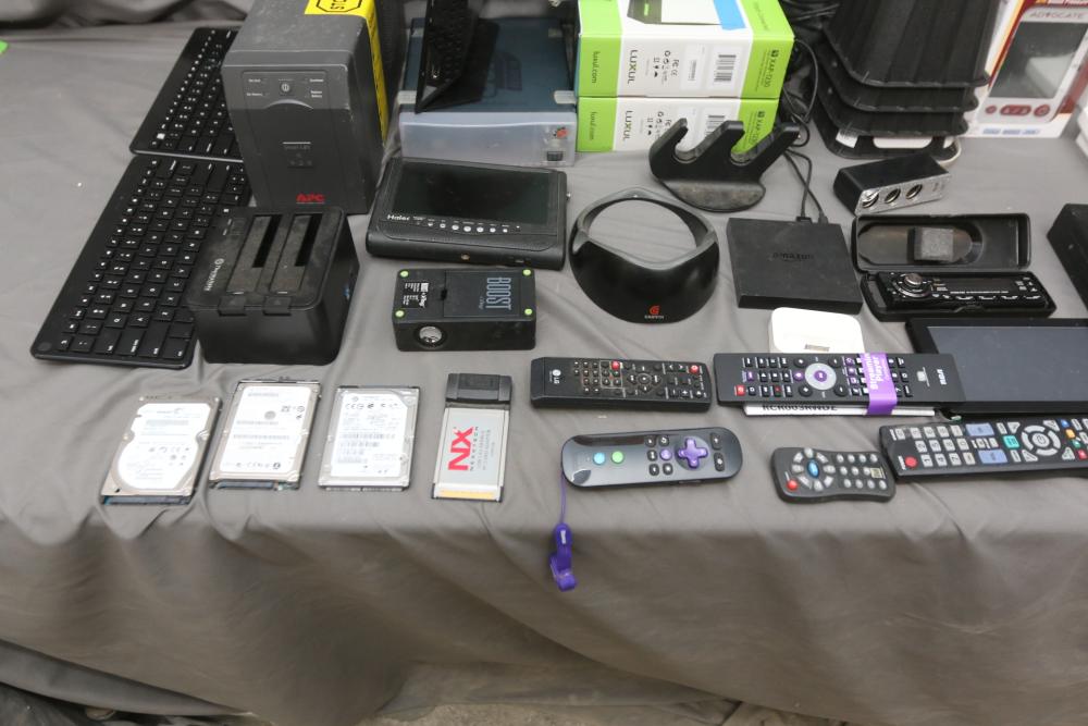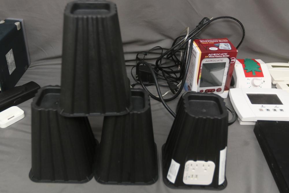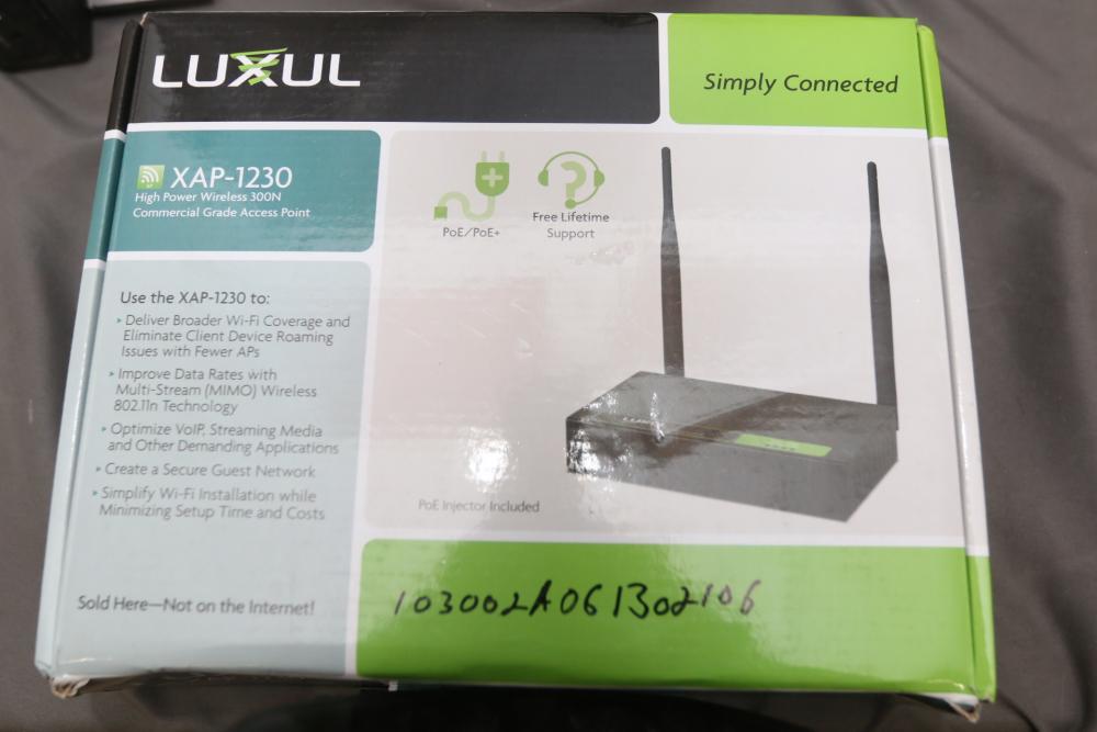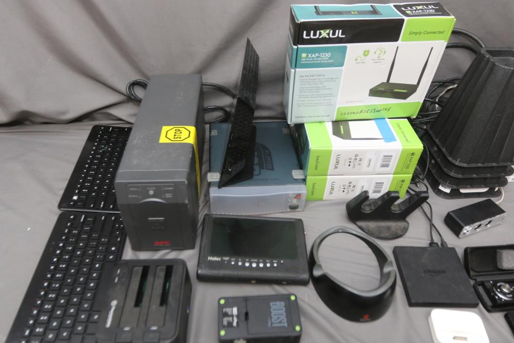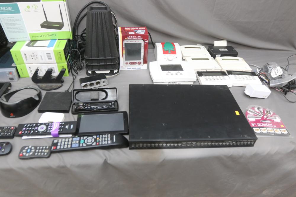 Computer and network accessories incl Luxul commercial grade omni access point model XAP-1030, remote controls, car audio head unit, Sylvania tablet, Griffin loop for iPad, Advocate arm blood pressure monitor, gvi 16 channel color triplex multiplexer model GV-MUX16TC, various thermostats, etc. Pickup only.