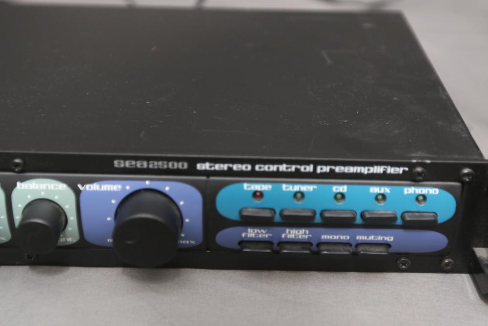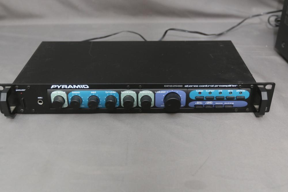 Audio equipment incl Pyramid starter control preamplifier model SEA2500, Kenwood stereo graphics equalizer model KE-294, Sony digital audio/video control center model STR-DE485, Gemini professional automatic BLM counter model BPM1. Pickup only.