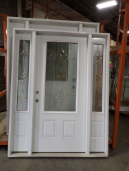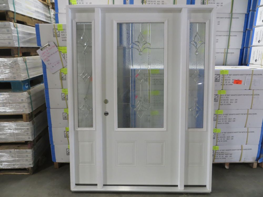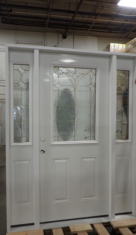 Decorative Entrance Door 36"x80" With 2 Side Lights RH. Prehung, Nickel 22x48 Glass, Romeo & Juliet Pattern, 4 9/16 Jamb, Actual 63 3/8 x 81 1/2. Grade: A *Any manufacturer warranties are NOT VALID with any purchase at our Auctions unless stated otherwise.. Weight: 190 lbs.. Sold by: Door. Sold as: Quantity x Price.