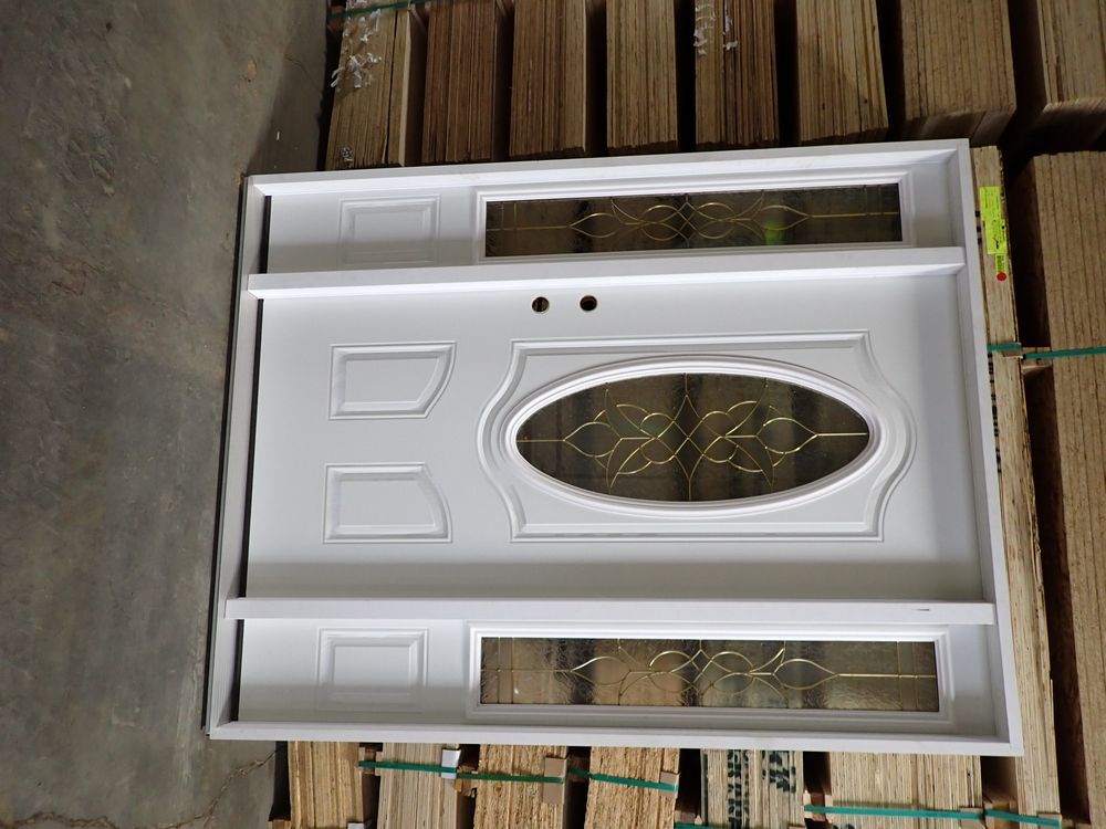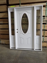Decorative Entrance Door 36" x 80" With 2 Side Lights RH. Prehung, Brass Oval Glass, Sense & Sensibilty Pattern, 4 9/16" Jamb, Actual Size 63 3/8" x 81 1/2". Grade: A.  NOTE:  This door has some minor imperfections.  Please pay attention to photos. *Any manufacturer warranties are NOT VALID with any purchase at our Auctions unless stated otherwise.. Weight: 190. Sold by: Door. Sold as: Quantity x Price.