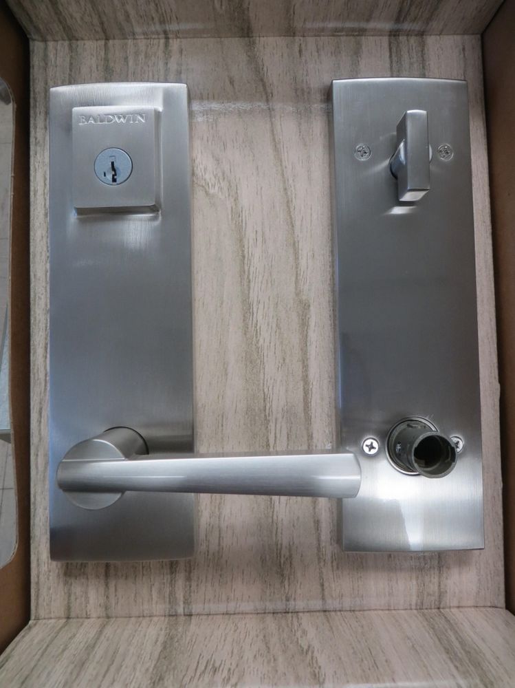 Satin Nickle Finish, Handle and Lock set. By Baldwin, Prestige Series, Spyglass Lever Entrance, Smartkey Technology, Universal For Left And Right Hand Doors. Grade: 1st. Weight: x. Sold by: Piece. Sold as: Quantity x Price.