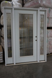 Decorative Entrance Door 36"x80" With 2 Side Lights RH. Prehung, Brass 22x64 Glass, Romeo & Juliet Pattern, 4 9/16 Jamb, Actual 63 3/8 x 81 1/2. Grade: A *Any manufacturer warranties are NOT VALID with any purchase at our Auctions unless stated otherwise.. Weight: 190 lbs.. Sold by: Door. Sold as: Quantity x Price.