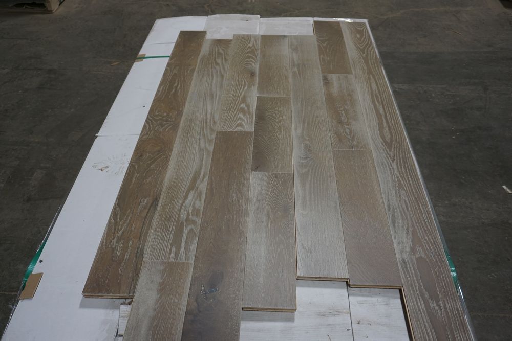 White Oak Sea Pearl Engineered Hardwood Flooring 1/2"x5"xRL. By Mullican, Prefinished, Wirebrushed. Grade: A, 8 Boxes, 39 SF Per Box, *Boxes may be damaged, pay attention to photos* *Any manufacturer warranties are NOT VALID with any purchase at our Auctions unless stated otherwise.. Weight: X. Sold by: Square Foot. Sold as: Quantity x Price.