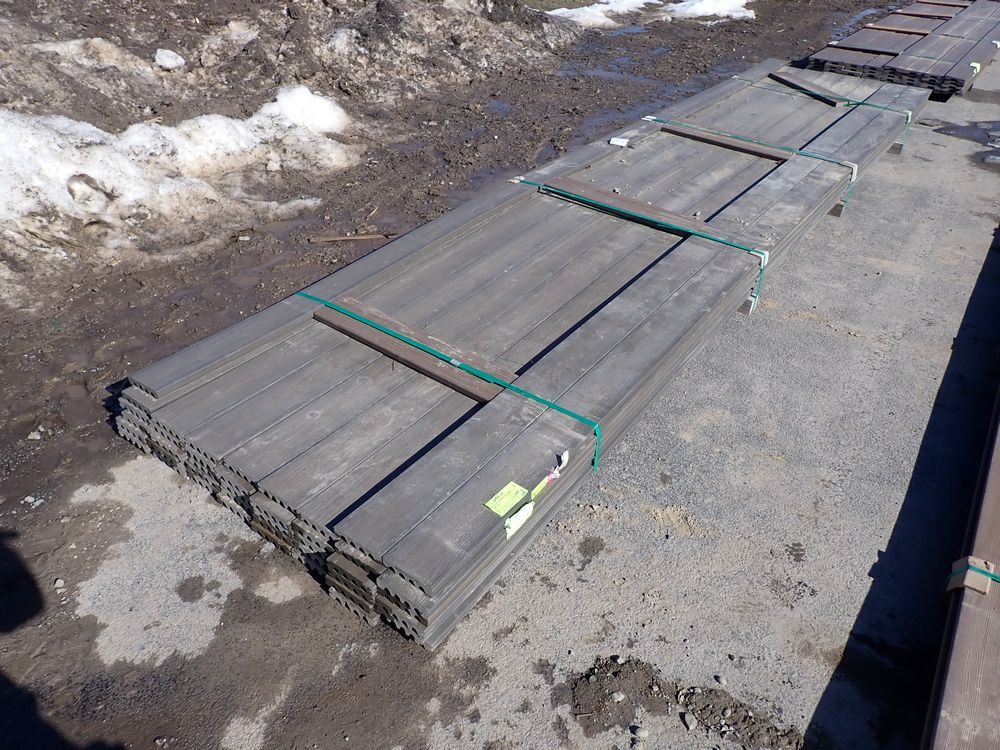 Grey Composite Decking 1"x6"x16'. PVC Cap. Grade: 2nd. Double Groove. 16 Boards *Any manufacturer warranties are NOT VALID with any purchase at our Auctions unless stated otherwise.. Weight: 800 lbs.. Sold by: Linear Foot. Sold as: Quantity x Price.