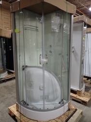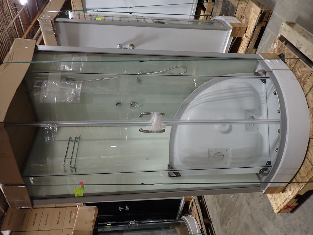 Luxury Walk-In Shower Room 40" x 40" x 86" CD *SEE DESC. White Walls. 10" Rain fall Shower Head, 3-Massage Jets, Height Adjustable 4-Pattern Shower Head, Soap Shelves, Radio, Foot Massager, Ventilation Fan, and Pre-Plumbed. Grade: A.  NOTE: This unit is missing the top and bottom rails, missing rail on glass side, top is cracked, missing screws, and has missing and broken door rollers. Installation Instructions Can Be Found Under The Documents Tab Under This Item. *Any manufacturer warranties are NOT VALID with any purchase at our Auctions unless stated otherwise.. Weight: 300. Sold by: Piece. Sold as: Quantity x Price.