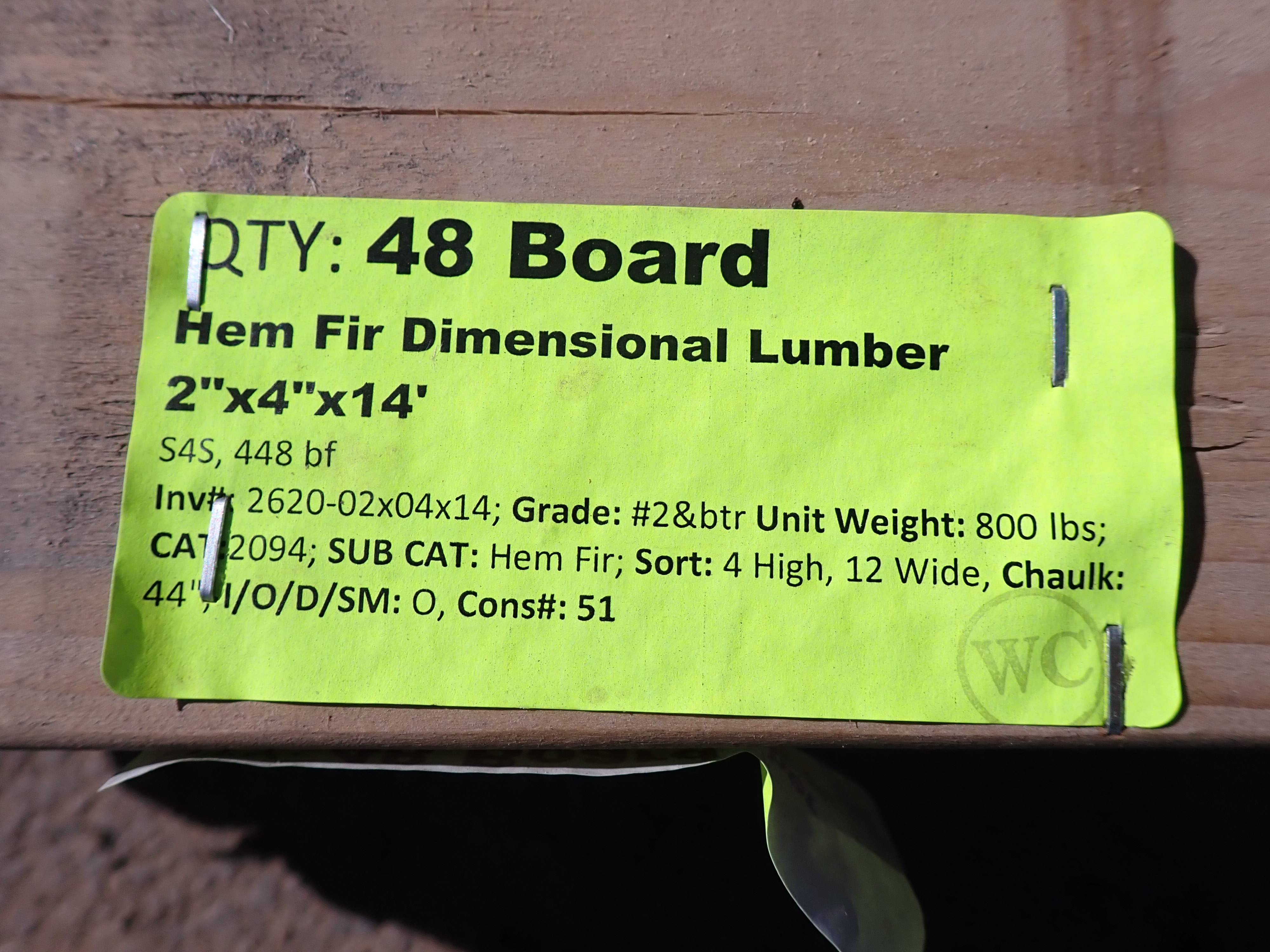 Hem Fir Dimensional Lumber 2" x 4" x 14'. S4S, 448 bf. Grade: #2&btr. *Any manufacturer warranties are NOT VALID with any purchase at our Auctions unless stated otherwise.. Weight: 800. Sold by: Board. Sold as: Quantity x Price.