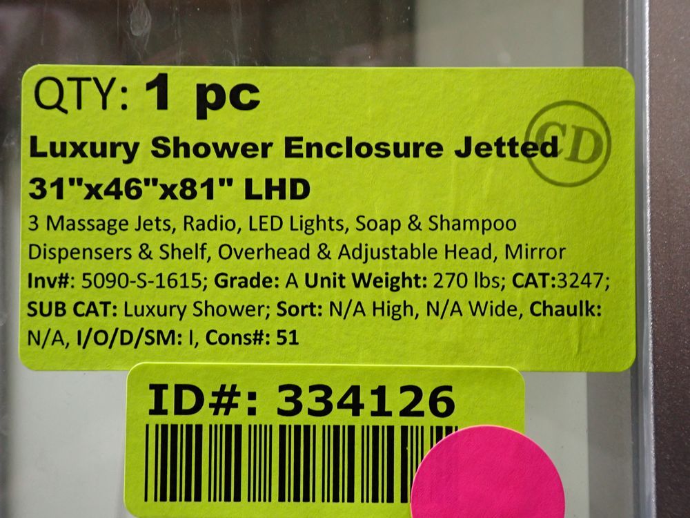 Luxury Shower Enclosure Jetted 31" x 46" x 81" RHD CD. 3 Massage Jets, Radio, LED Lights, Soap & Shampoo Dispensers & Shelf, Overhead & Adjustable Head & Mirror. Grade: A. *Any manufacturer warranties are NOT VALID with any purchase at our Auctions unless stated otherwise.. Weight: 270. Sold by: Piece. Sold as: Quantity x Price.