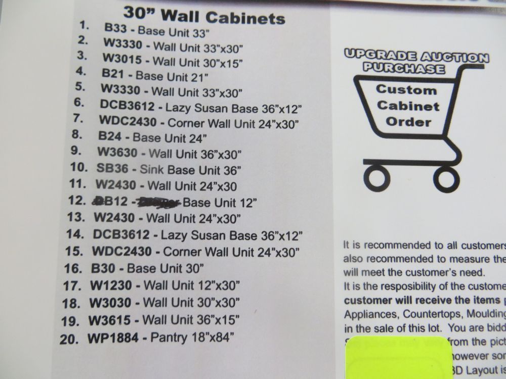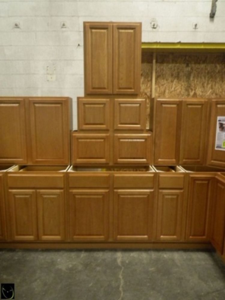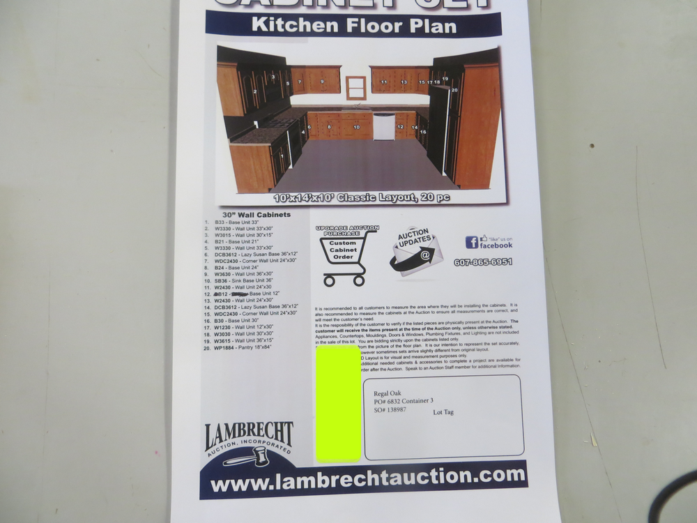 Regal Oak Kitchen Cabinet Set 10'x14'x10'. Classic Layout. 30" Walls. ASSEMBLY OPTION IS NOT AVAILABLE FOR THIS SET. By GHI, Additional pieces may be available for order to the high bidder. Additional cabinets ship boxed, ready to assemble. -All Wood Construction -3/4” Plywood with Veneer Oak Face Frame -Solid Oak Raised Panel Door with Veneer Center Panel -1/2” Plywood Box Construction -5/8” Plywood Shelf -Side Mount Glides and Plywood Drawer Box -Concealed Hinges -Additional Wall Cabinets Available in the Following Sizes; 30”, 36”, and 42”; if you would like a different size that what this cabinet is listed as please call our office at 607-865-6951 for a quote. Enclosed in each cabinet set will be a Build Sheet which lists the individual cabinets in each set. As the cabinets are palletized each cabinet will be checked off and signed by our staff member to ensure that the set is complete at the time of pick-up. Please keep this Build Sheet on hand because it will be required if there is an issue with your cabinet set. Cabinet issues will not be addressed without this build sheet. *Any manufacturer warranties are NOT VALID with any purchase at our Auctions unless stated otherwise.. Weight: x. Sold by: Set. Sold as: Quantity x Price.