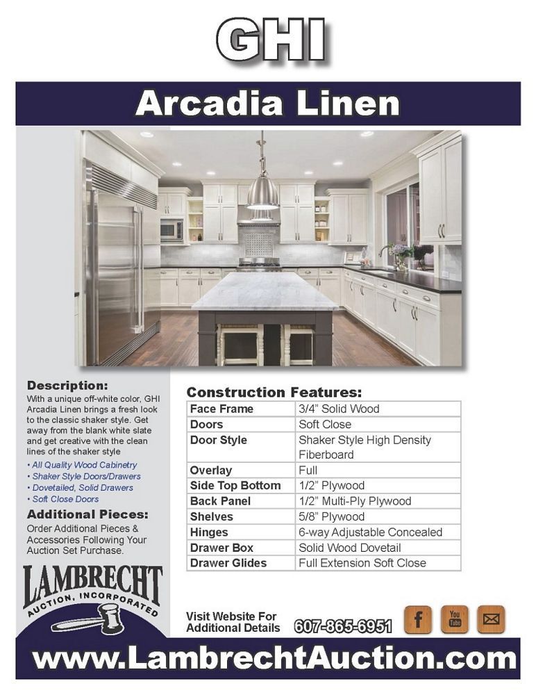 Arcadia Linen Kitchen Cabinet Set 12' x 12'. Classic Layout. 30" Walls. ASSEMBLY OPTION IS NOT AVAILABLE FOR THIS SET. By GHI, Additional pieces may be available for order to the high bidder. Additional cabinets ship boxed, ready to assemble. -3/4” Solid Wood Face Frame -High Density Fiberboard Shaker Style Door and Drawer Front -1/2” Plywood Box Construction -5/8” Plywood Shelves -Full Overlay Doors and Drawer Fronts -Solid Wood Dovetail Drawer box -Soft Close Full Extension Drawer Gliders -Soft Close Doors -6-Way Adjustable Concealed Hinges -Additional Wall Cabinets Available in the Following Sizes; 30”, 36”, and 42”; if you would like a different size that what this cabinet is listed as please call our office at 607-865-6951 for a quote. Enclosed in each cabinet set will be a Build Sheet which lists the individual cabinets in each set. As the cabinets are palletized each cabinet will be checked off and signed by our staff member to ensure that the set is complete at the time of pick-up. Please keep this Build Sheet on hand because it will be required if there is an issue with your cabinet set. Cabinet issues will not be addressed without this build sheet. *Any manufacturer warranties are NOT VALID with any purchase at our Auctions unless stated otherwise.. Weight: x. Sold by: Set. Sold as: Quantity x Price.