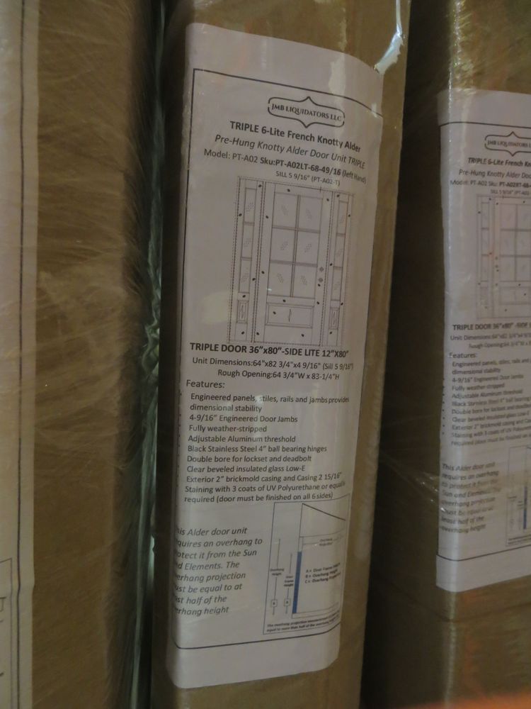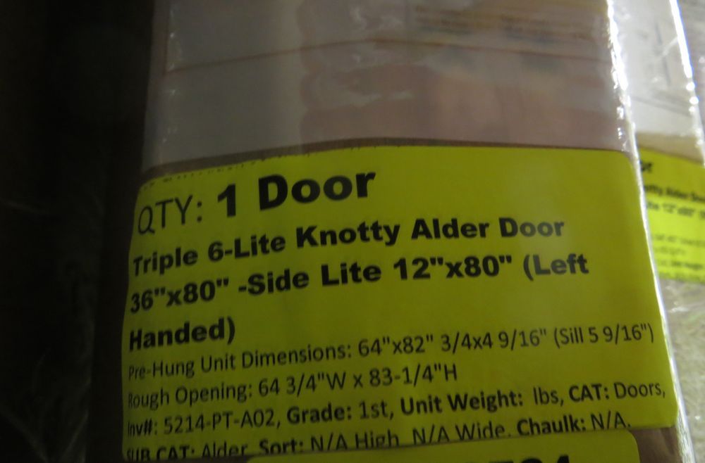 Triple 6-Lite Knotty Alder Door 36"x80" Side Lite 12"x80" LH. Pre-Hung Unit Dimensions: 64"x82" 3/4x4 9/16" (Sill 5 9/16"). Rough Opening: 64 3/4" W x 83-1/4"H *Any manufacturer warranties are NOT VALID with any purchase at our Auctions unless stated otherwise.. Weight: x. Sold by: Door. Sold as: Quantity x Price.