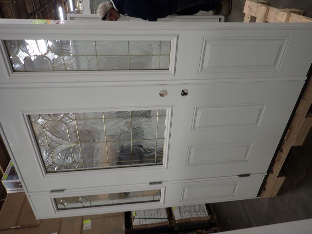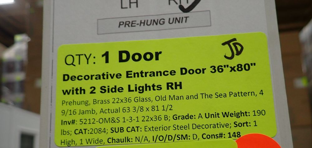 Decorative Entrance Door 36" x 80" With 2 Side Lights RH. Prehung, Brass 22" x 36" Glass, Old Man and The Sea Pattern, 4 9/16" Jamb, Actual Size 63 3/8" x 81 1/2". Grade: A *Any manufacturer warranties are NOT VALID with any purchase at our Auctions unless stated otherwise.. Weight: 190. Sold by: Door. Sold as: Quantity x Price.