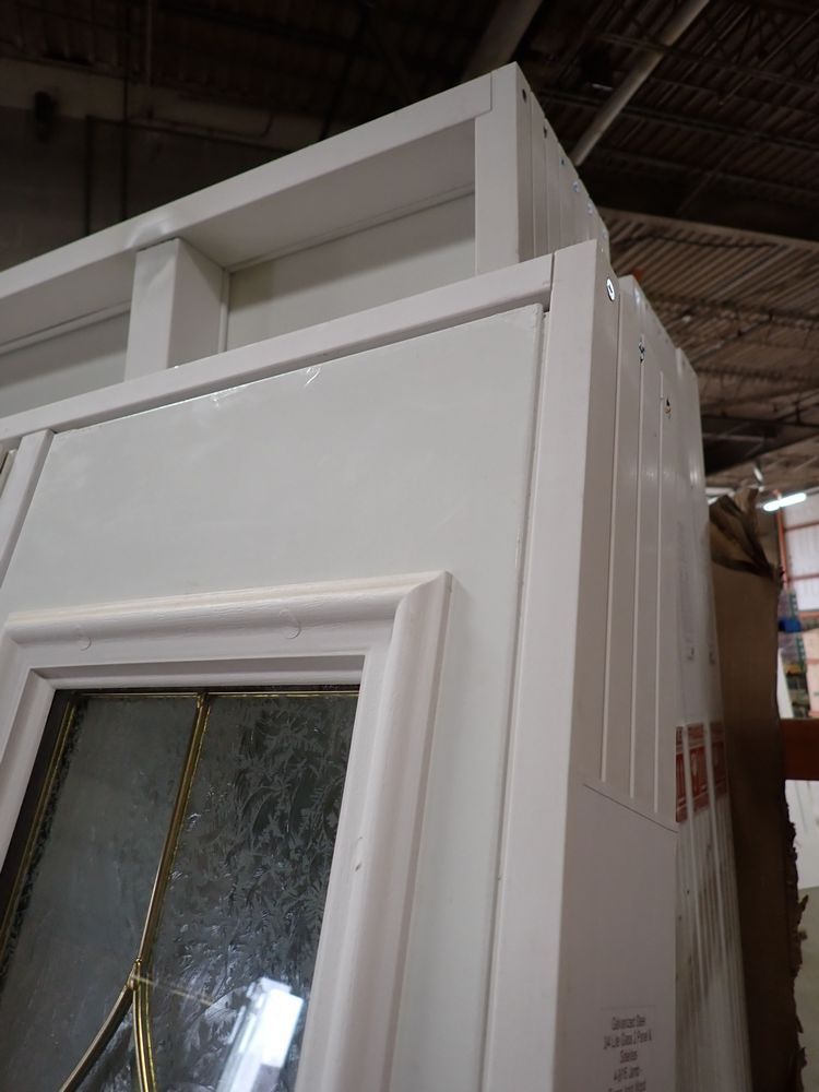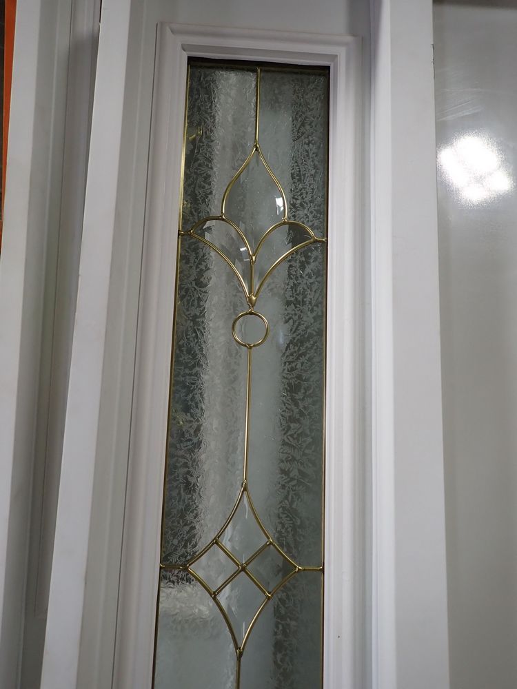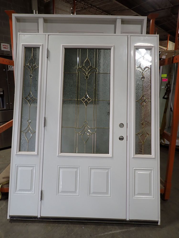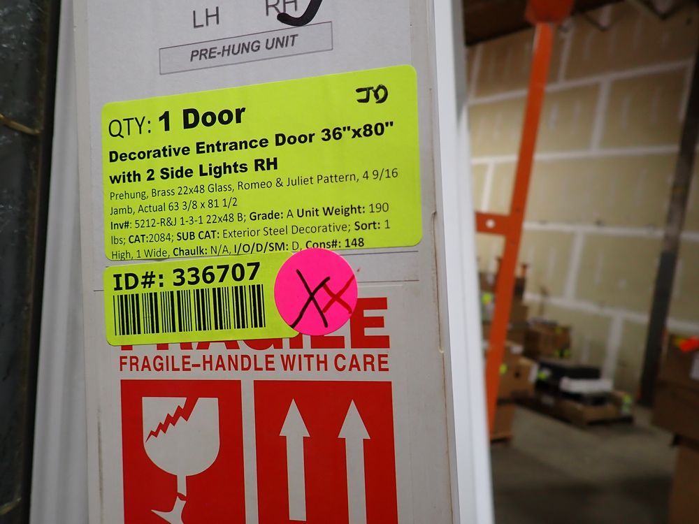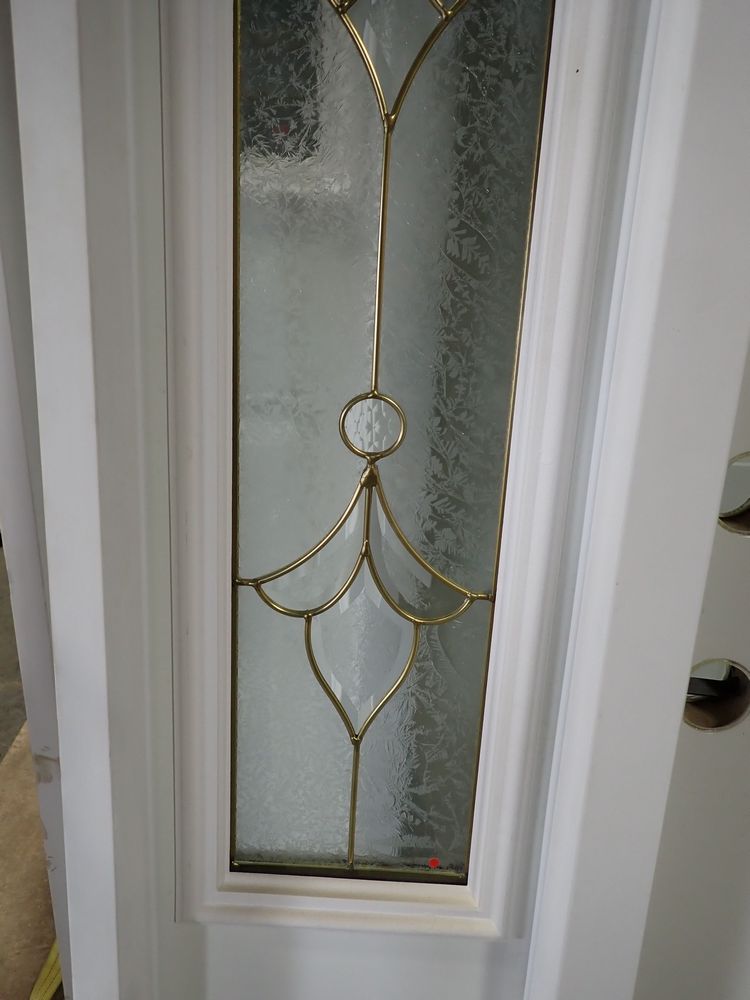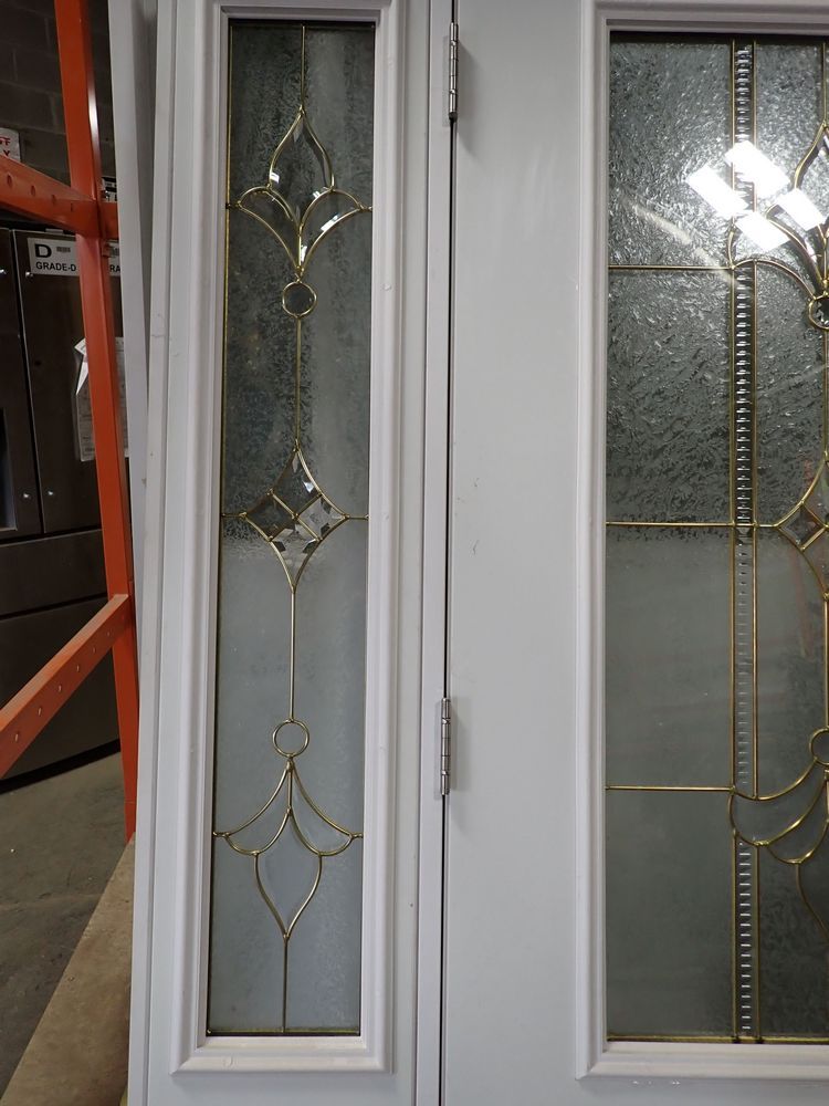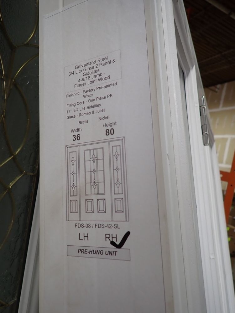 Decorative Entrance Door 36"x80" With 2 Side Lights RH. Prehung, Brass 22x48 Glass, Romeo & Juliet Pattern, 4 9/16 Jamb, Actual 63 3/8 x 81 1/2. Grade: A *Any manufacturer warranties are NOT VALID with any purchase at our Auctions unless stated otherwise.. Weight: 190 lbs.. Sold by: Door. Sold as: Quantity x Price.