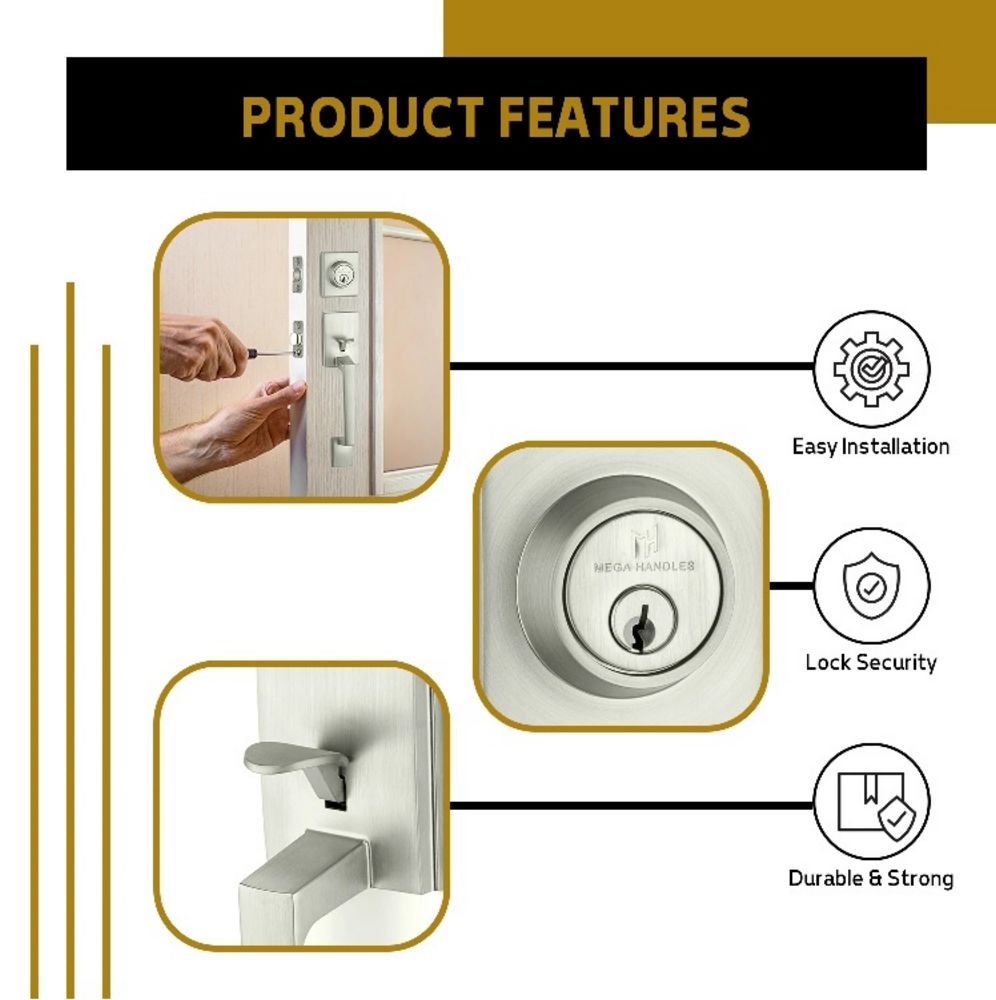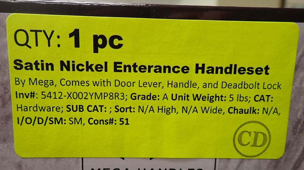 Satin Nickel Entrance Handleset. By: Mega. Comes with Door Lever, Handle, and Deadbolt Lock. Grade: A. *Any manufacturer warranties are NOT VALID with any purchase at our Auctions unless stated otherwise.. Weight: 5. Sold by: Piece. Sold as: Quantity x Price.