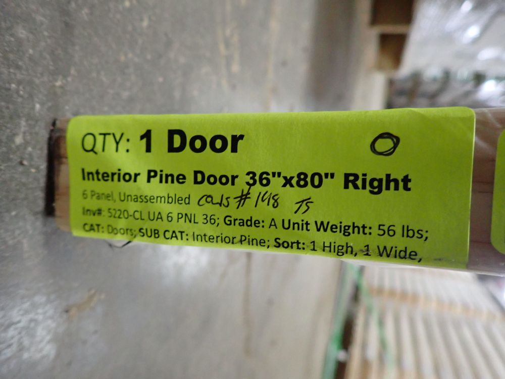 Clear Pine Interior Door 36"x80" 6PNL RH (Unassembled). Grade A *Any manufacturer warranties are NOT VALID with any purchase at our Auctions unless stated otherwise.. Weight: X. Sold by: Door. Sold as: Quantity x Price.