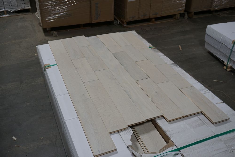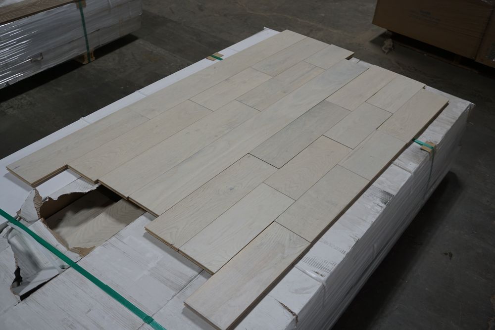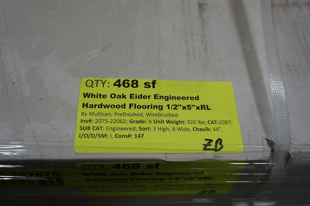 White Oak Eider Engineered Hardwood Flooring 1/2" x 5" x RL. By Mullican, Prefinished, Wirebrushed. Grade: A, 12 Boxes, 39 SF Per Box, *Boxes may be damaged, pay attention to photos* *Any manufacturer warranties are NOT VALID with any purchase at our Auctions unless stated otherwise.. Weight: 920 lbs. Sold by: Square Foot. Sold as: Quantity x Price.