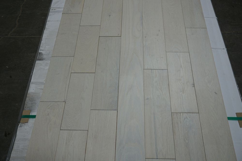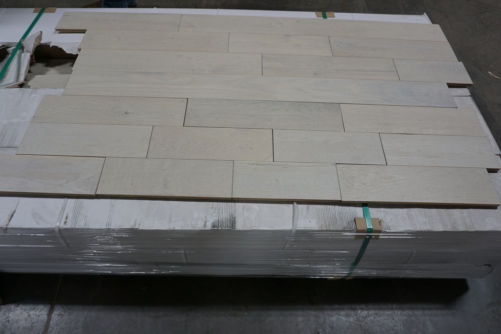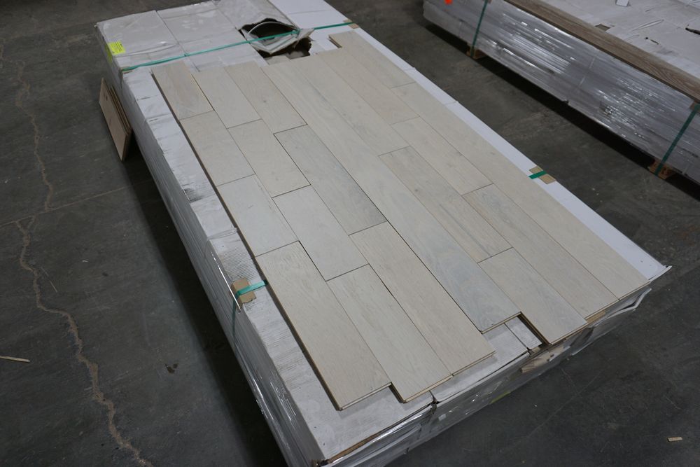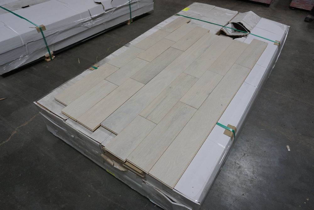 White Oak Eider Engineered Hardwood Flooring 1/2" x 5" x RL. By Mullican, Prefinished, Wirebrushed. Grade: A, 12 Boxes, 39 SF Per Box, *Boxes may be damaged, pay attention to photos* *Any manufacturer warranties are NOT VALID with any purchase at our Auctions unless stated otherwise.. Weight: 920 lbs. Sold by: Square Foot. Sold as: Quantity x Price.