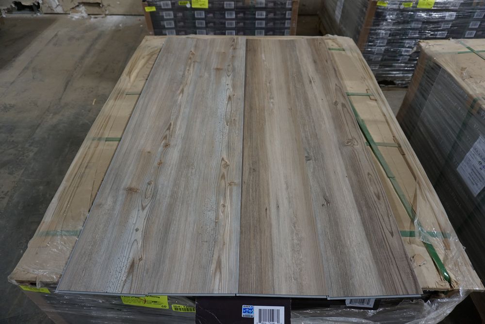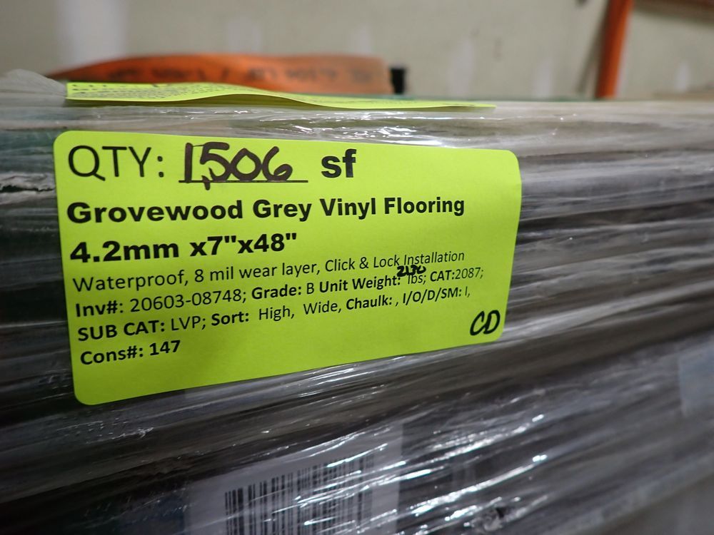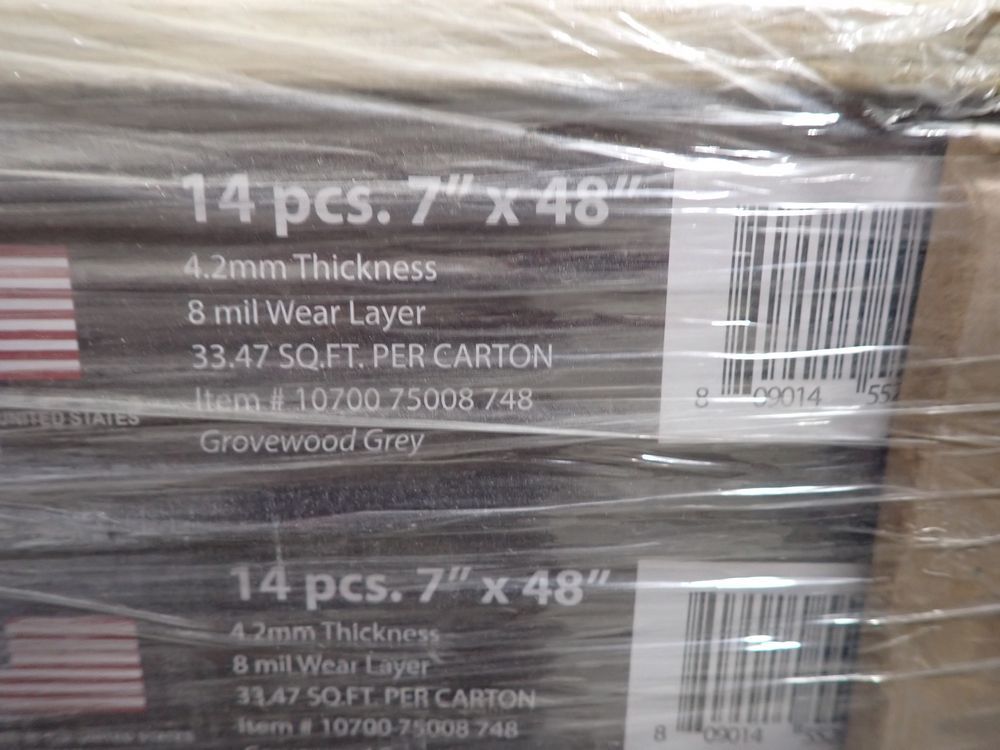 Grovewood Grey Vinyl Flooring 4.2mm x 7" x 48". Waterproof, 8 mil Wear Layer, Click and Lock Installation. Grade: B. 45 Boxes, 14 Pcs Per Box, 33.47 SF Per Box *Any manufacturer warranties are NOT VALID with any purchase at our Auctions unless stated otherwise.. Weight: 2130. Sold by: Square Foot. Sold as: Quantity x Price.