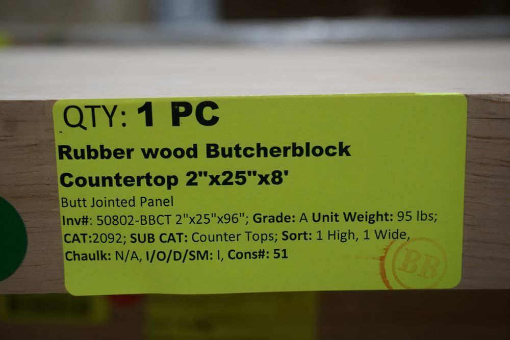 Rubber Wood Butcherblock Countertop 2" x 25" x 8'. Butt Jointed Panel. Grade: A *Any manufacturer warranties are NOT VALID with any purchase at our Auctions unless stated otherwise.. Weight: 95. Sold by: Piece. Sold as: Quantity x Price.