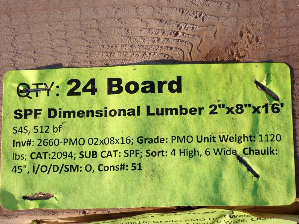 SPF Dimensional Lumber 2" x 8" x 16'. S4S, 512 bf. Grade: PMO. *Any manufacturer warranties are NOT VALID with any purchase at our Auctions unless stated otherwise.. Weight: 1120. Sold by: Board. Sold as: Quantity x Price.