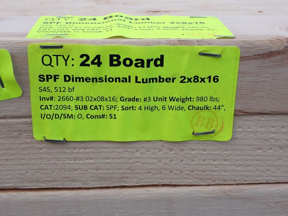 SPF Dimensional Lumber 2" x 8" x 16'. S4S, 512 bf. Grade: #3. *Any manufacturer warranties are NOT VALID with any purchase at our Auctions unless stated otherwise.. Weight: 980. Sold by: Board. Sold as: Quantity x Price.
