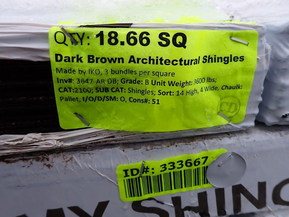 18.66 Dark Brown Architectural Shingles. Made By IKO, 3 Bundles Per Square, Grade: B *Any manufacturer warranties are NOT VALID with any purchase at our Auctions unless stated otherwise.. Weight: 3600. Sold by: Square . Sold as: Quantity x Price.