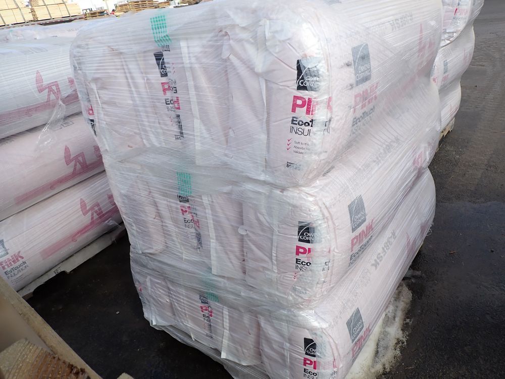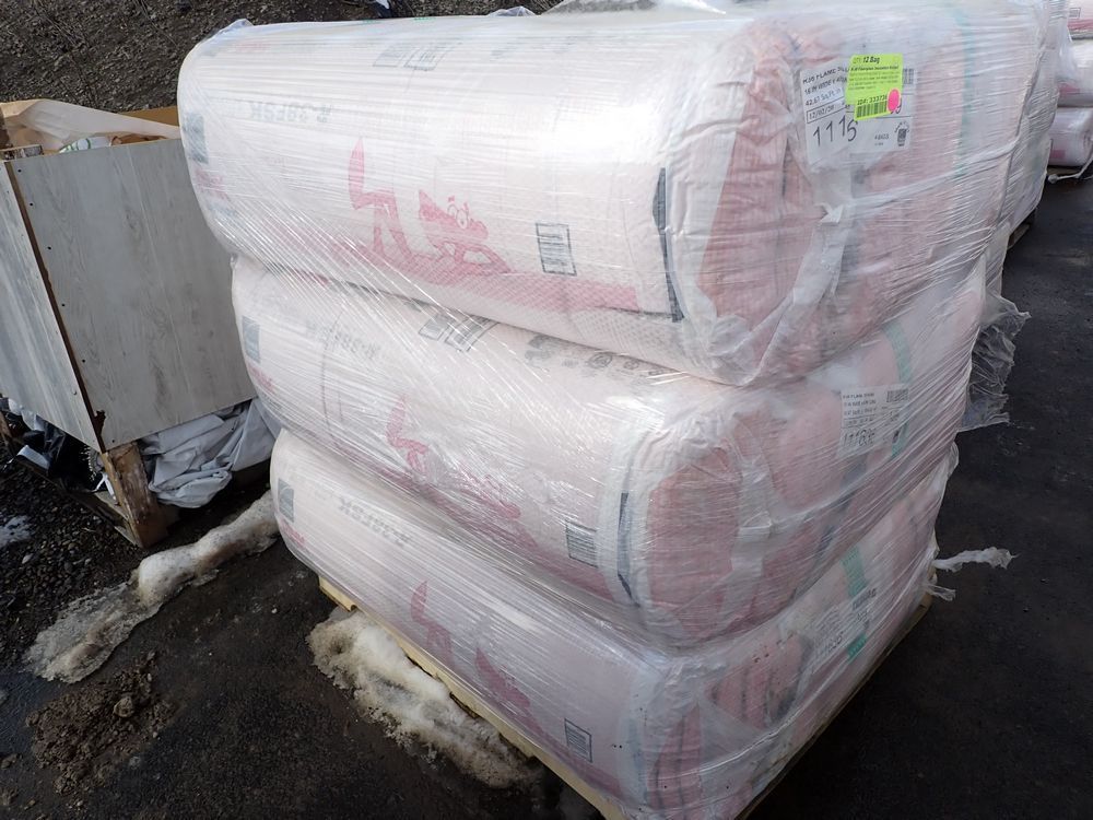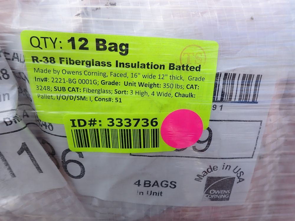R-38 Fiberglass Insulation Batted. Made by Owens Corning, Faced, 16" wide 12" thick, Grade *Any manufacturer warranties are NOT VALID with any purchase at our Auctions unless stated otherwise.. Weight: 350 lbs.. Sold by: Bag. Sold as: Quantity x Price.