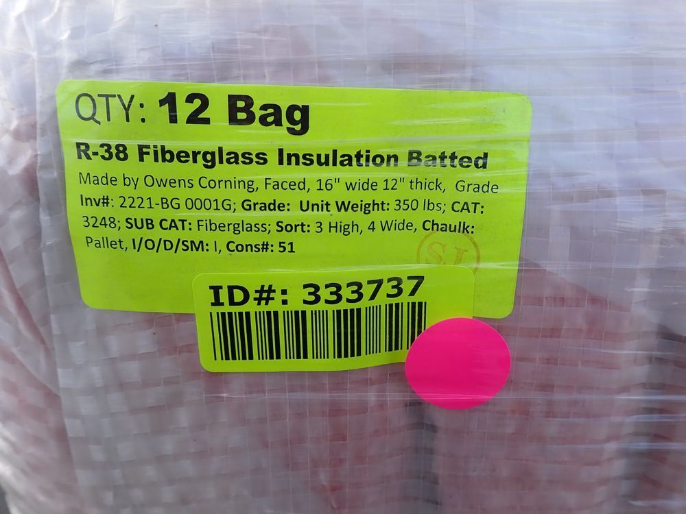 R-38 Fiberglass Insulation Batted. Made by Owens Corning, Faced, 16" wide 12" thick, Grade *Any manufacturer warranties are NOT VALID with any purchase at our Auctions unless stated otherwise.. Weight: 350 lbs.. Sold by: Bag. Sold as: Quantity x Price.