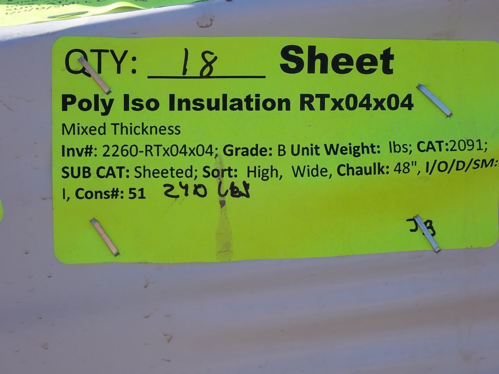 Poly Iso Insulation RTX04X04. Mixed Thickness. Grade B *Any manufacturer warranties are NOT VALID with any purchase at our Auctions unless stated otherwise.. Weight: 240 pounds. Sold by: Sheet. Sold as: Quantity x Price.