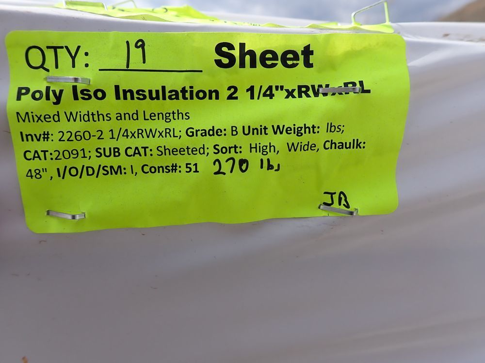 Poly Iso Insulation 2 1/4" x RW x RL. Mixed Widths, and Lengths. Grade: B. *Any manufacturer warranties are NOT VALID with any purchase at our Auctions unless stated otherwise.. Weight: 270. Sold by: Sheet. Sold as: Quantity x Price.