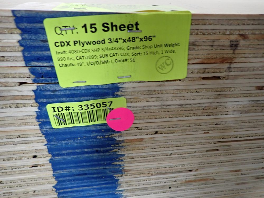CDX Plywood 3/4" x 48" x 96". Grade: Shop. *Any manufacturer warranties are NOT VALID with any purchase at our Auctions unless stated otherwise.. Weight: 890. Sold by: Sheet. Sold as: Quantity x Price.