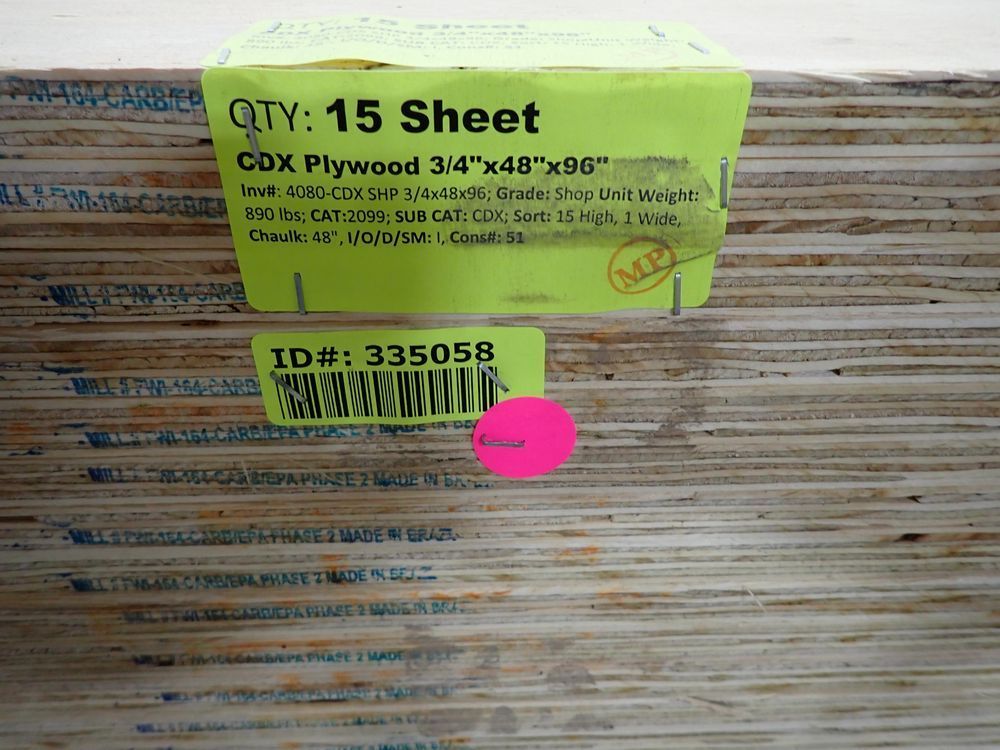 CDX Plywood 3/4" x 48" x 96". Grade: Shop. *Any manufacturer warranties are NOT VALID with any purchase at our Auctions unless stated otherwise.. Weight: 890. Sold by: Sheet. Sold as: Quantity x Price.