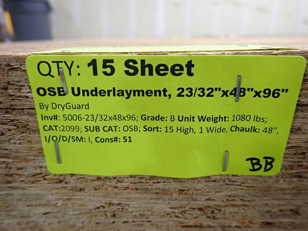 OSB Underlayment 23/32" x 48" x 96". By: DryGuard. Grade: B. *Any manufacturer warranties are NOT VALID with any purchase at our Auctions unless stated otherwise.. Weight: 1080. Sold by: Sheet. Sold as: Quantity x Price.