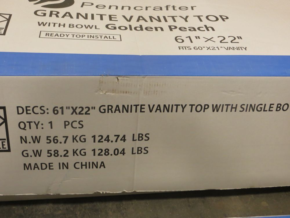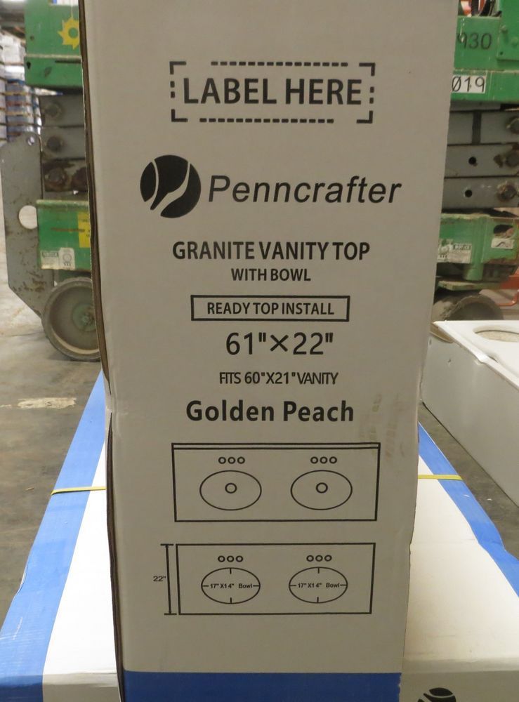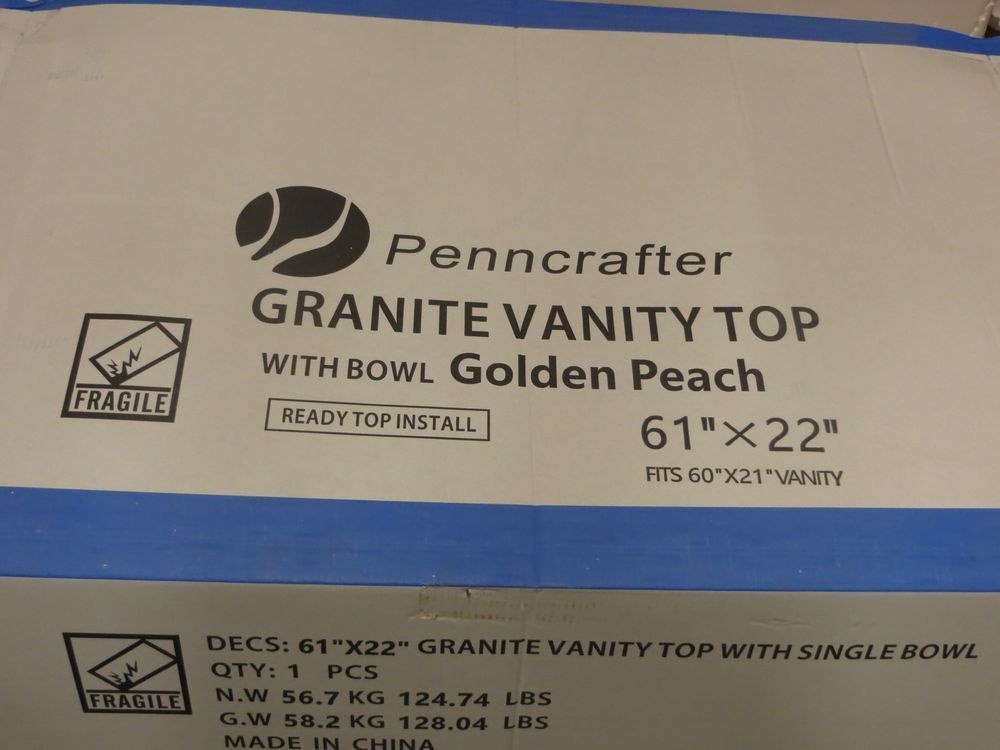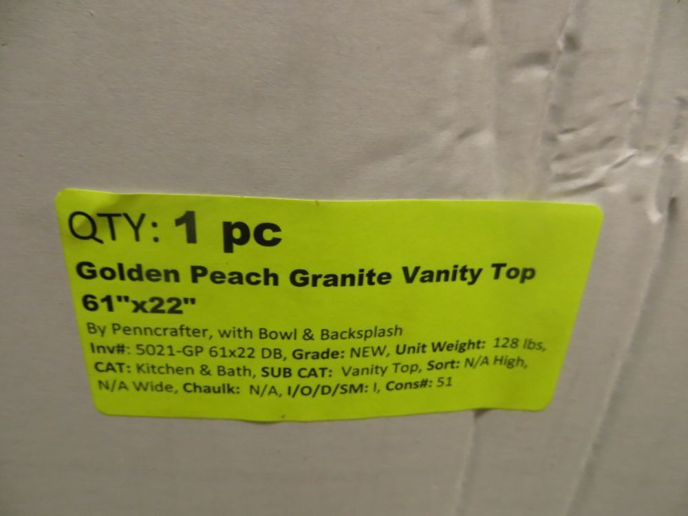 Golden Peach Granite Vanity Top 61" x 22". Penncrafter, with Bowl & Backsplash; Grade New *Any manufacturer warranties are NOT VALID with any purchase at our Auctions unless stated otherwise.. Weight: 128. Sold by: Piece. Sold as: Quantity x Price.