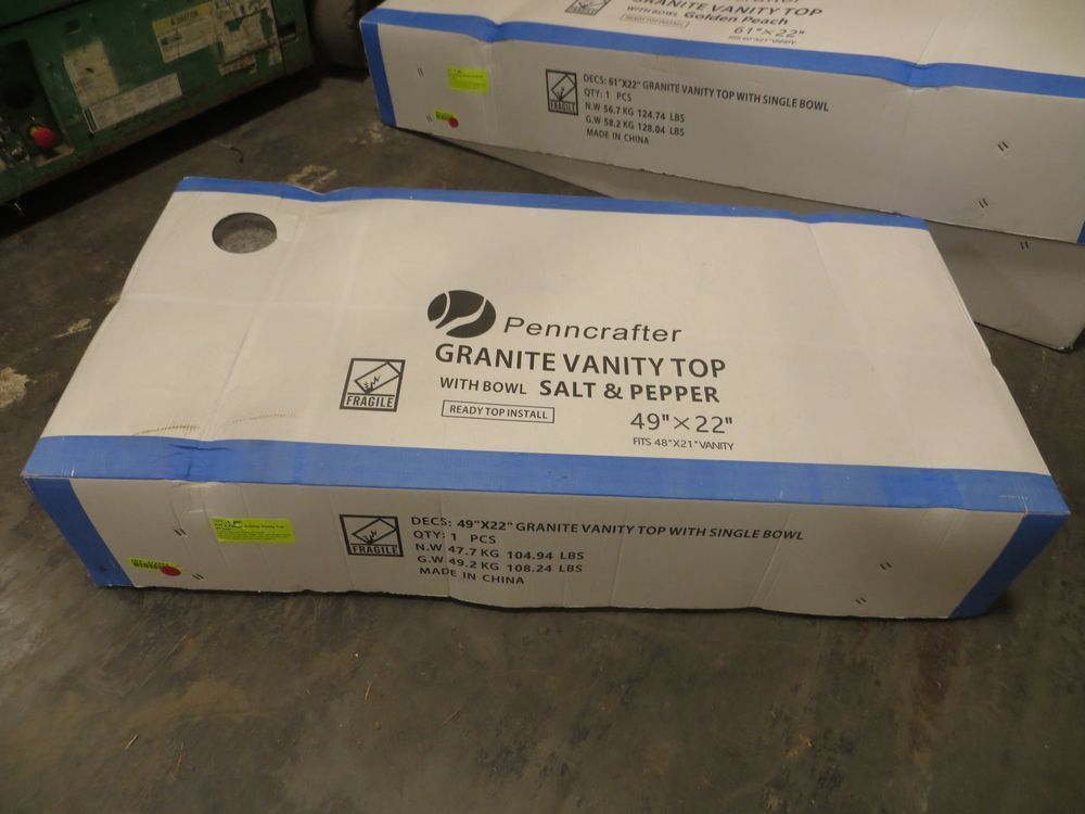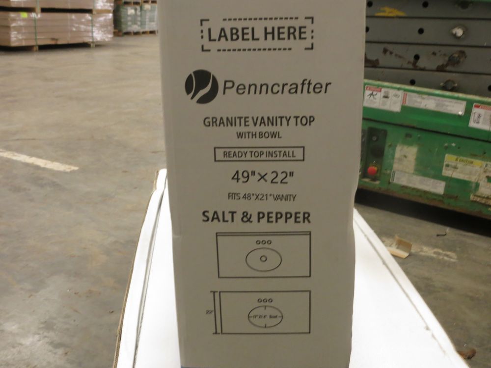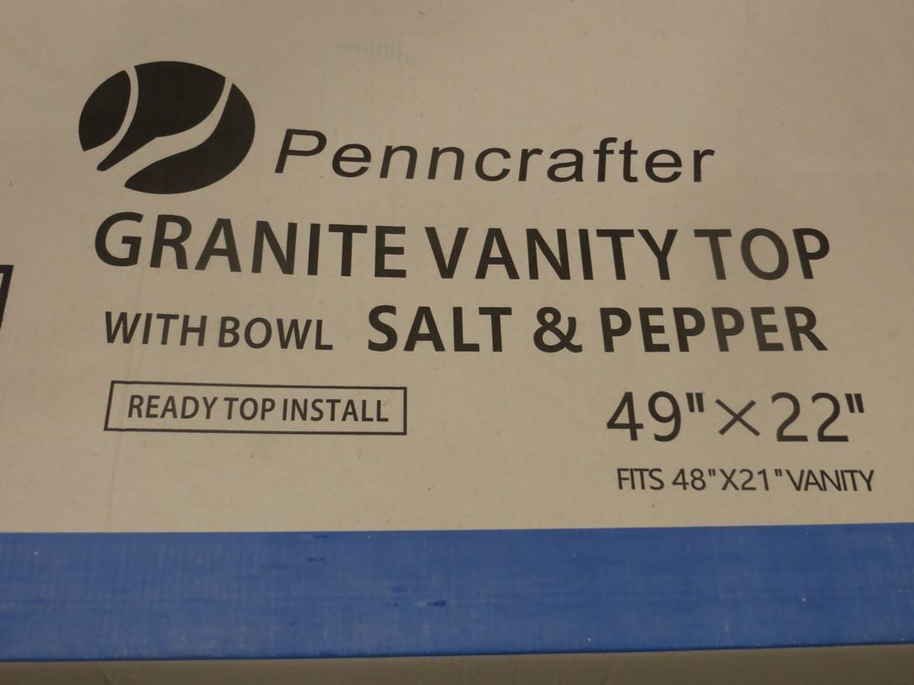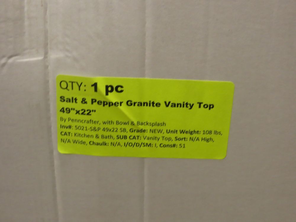Salt & Pepper Granite Vanity Top 49" x 22". By: Penncrafter, With Single Bowl And Backsplash, Grade: NEW *Any manufacturer warranties are NOT VALID with any purchase at our Auctions unless stated otherwise.. Weight: x. Sold by: Piece. Sold as: Quantity x Price.