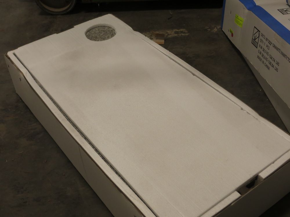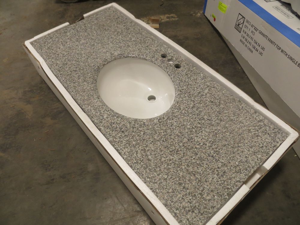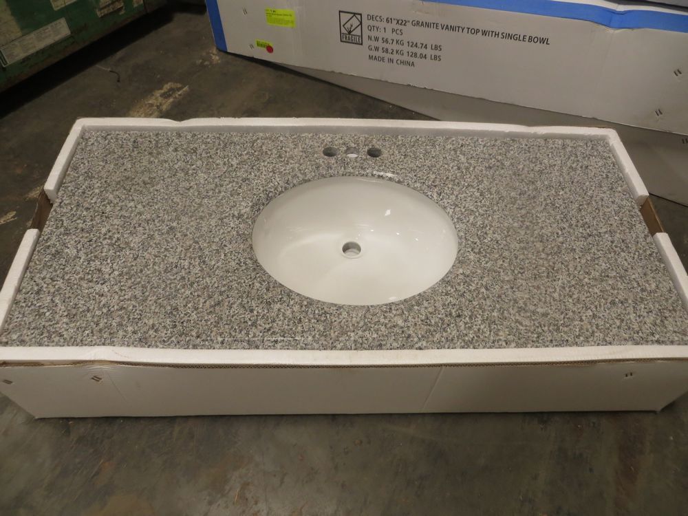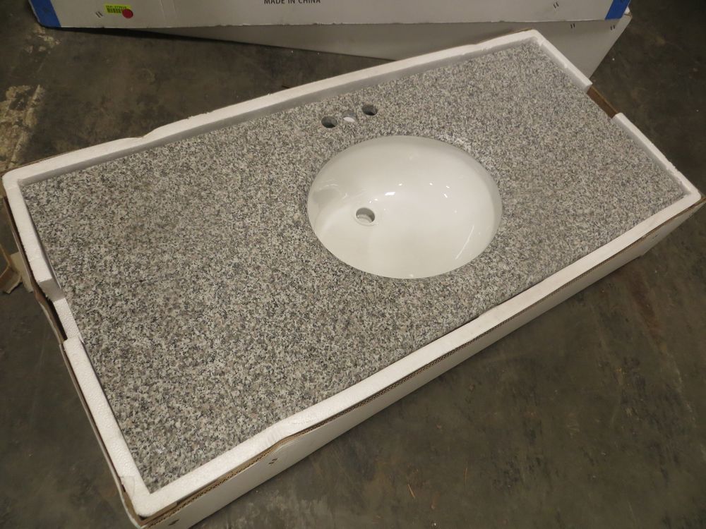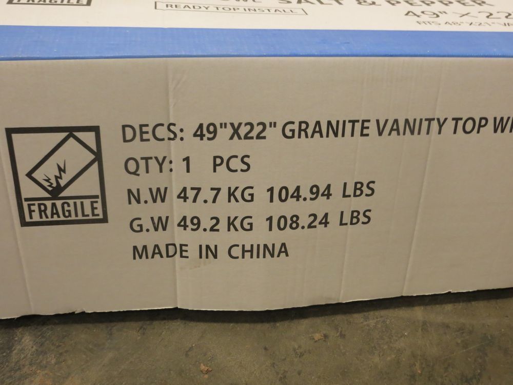 Salt & Pepper Granite Vanity Top 49" x 22". By: Penncrafter, With Single Bowl And Backsplash, Grade: NEW *Any manufacturer warranties are NOT VALID with any purchase at our Auctions unless stated otherwise.. Weight: x. Sold by: Piece. Sold as: Quantity x Price.