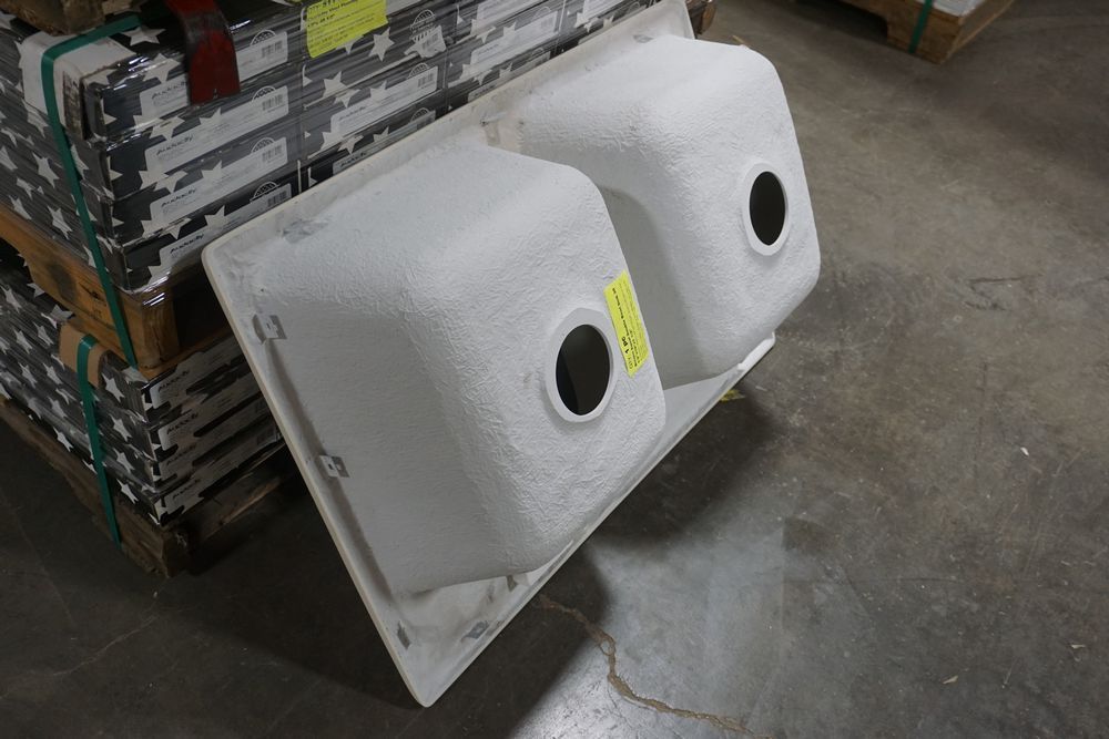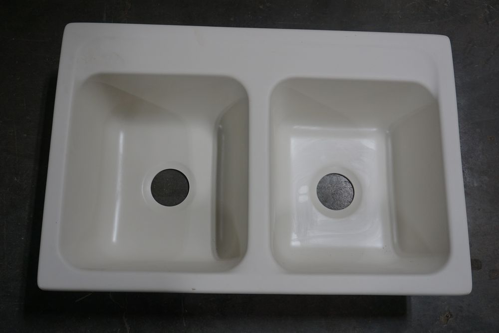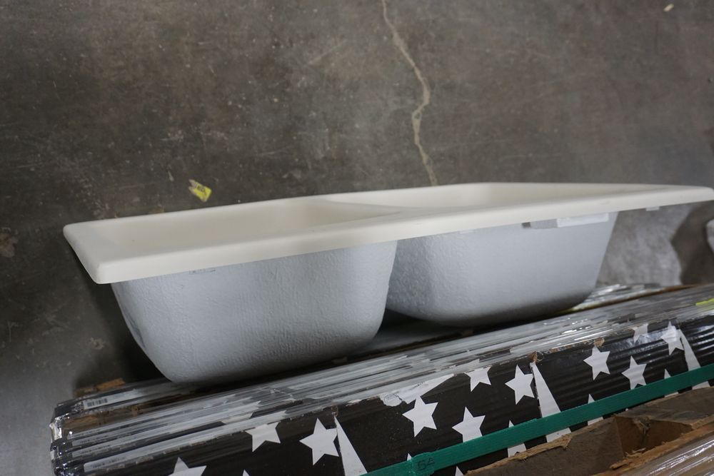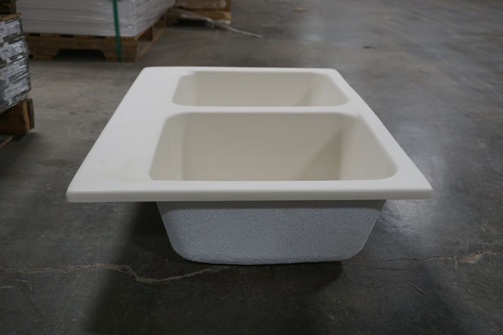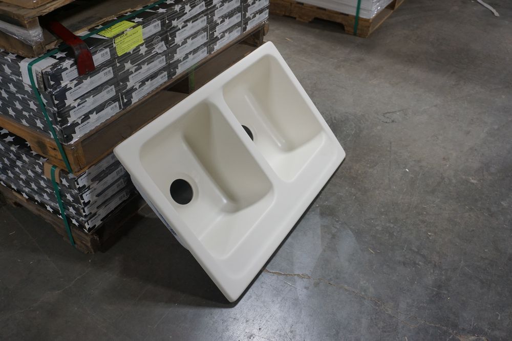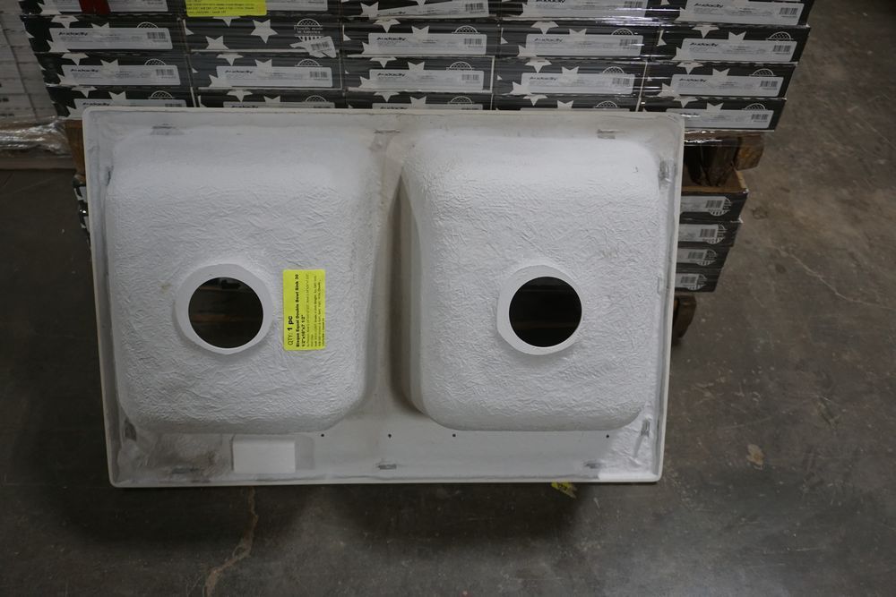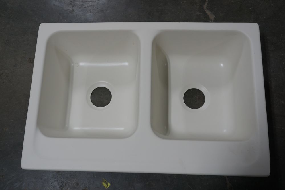 Bisque Equal Double Bowl Sink 33". By: Plexcor. Actual Dimensions: 33" (L) x 22" (W) x 7 3/4" (D). Each bowl actual dimensions are 14" (L) x 16" (W) x 7 1/2" (D). With Clip. Grade: A. *Any manufacturer warranties are NOT VALID with any purchase at our Auctions unless stated otherwise.. Weight: x. Sold by: Piece. Sold as: Quantity x Price.