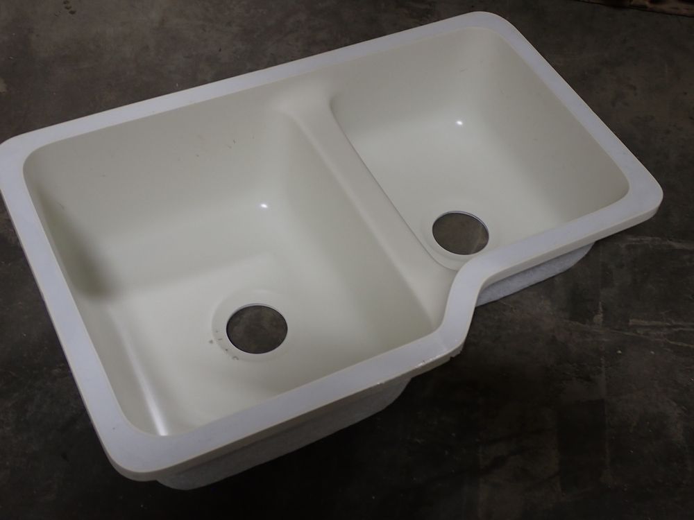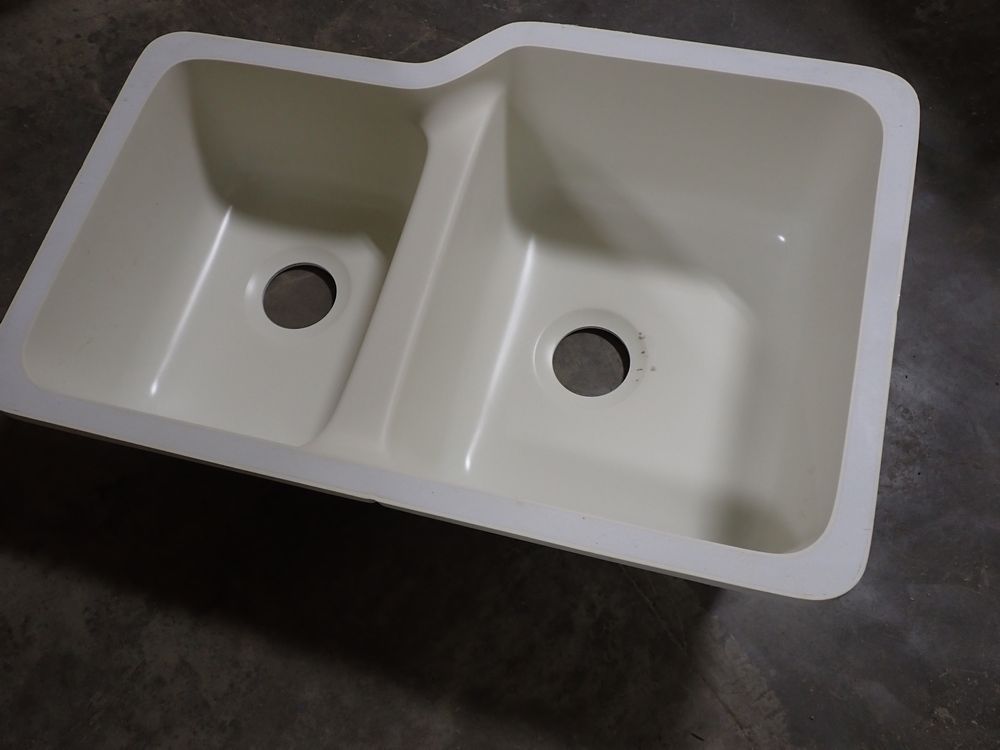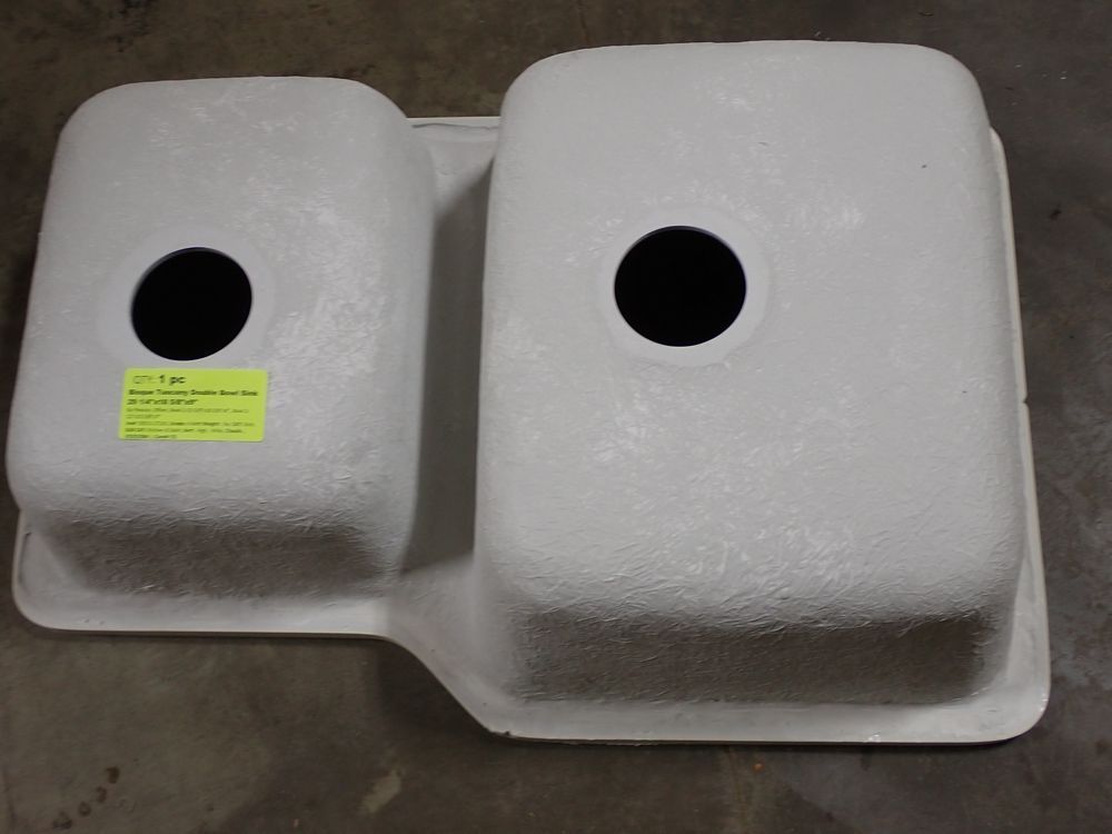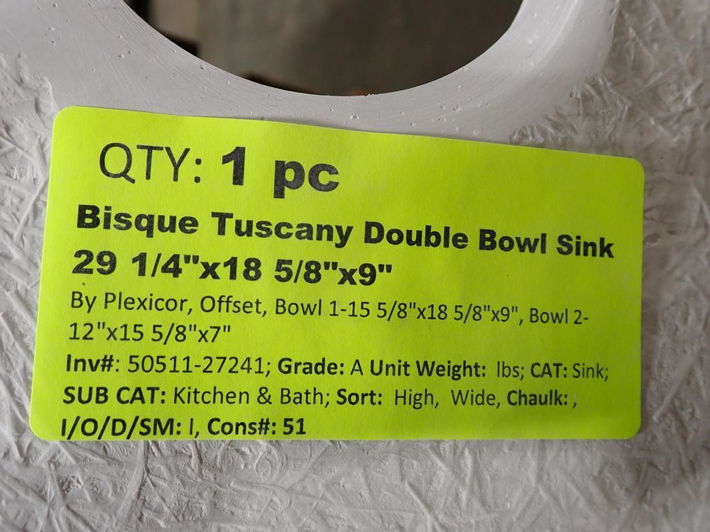 Bisque Tuscany Double Bowl Sink 29" x 18" x 9". By: Plexicor. Actual Dimensions are 29 1/4" x 18 5/8" x 9". Offset-Bowl 1 is 15 5/8" x 18 5/8" x 8, Bowl 2 is 12" x 15 5/8" x 7". Grade: A *Any manufacturer warranties are NOT VALID with any purchase at our Auctions unless stated otherwise.. Weight: x. Sold by: Piece. Sold as: Quantity x Price.