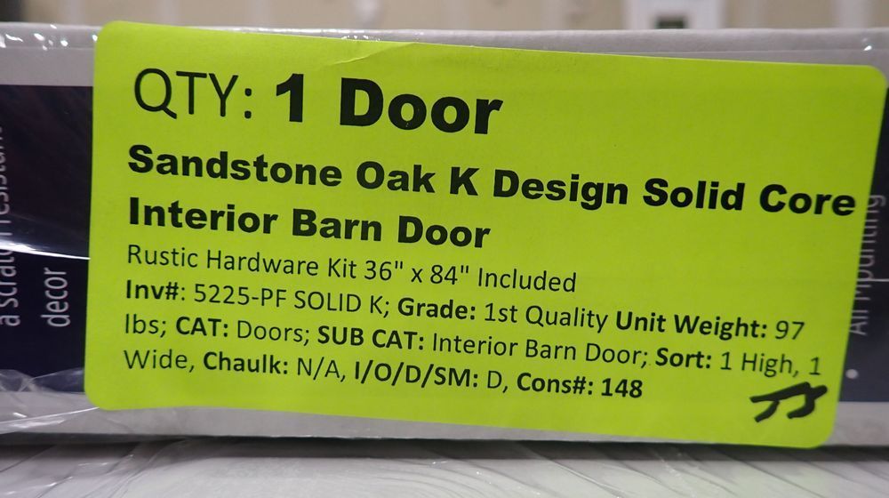 Sandstone Oak K Design Solid Core Interior Barn Door, Prefinished, Hardware Kit Included. Rustic Hardware Kit 36" x 84". Grade 1st Quality *Any manufacturer warranties are NOT VALID with any purchase at our Auctions unless stated otherwise.. Weight: 97. Sold by: Door. Sold as: Quantity x Price.