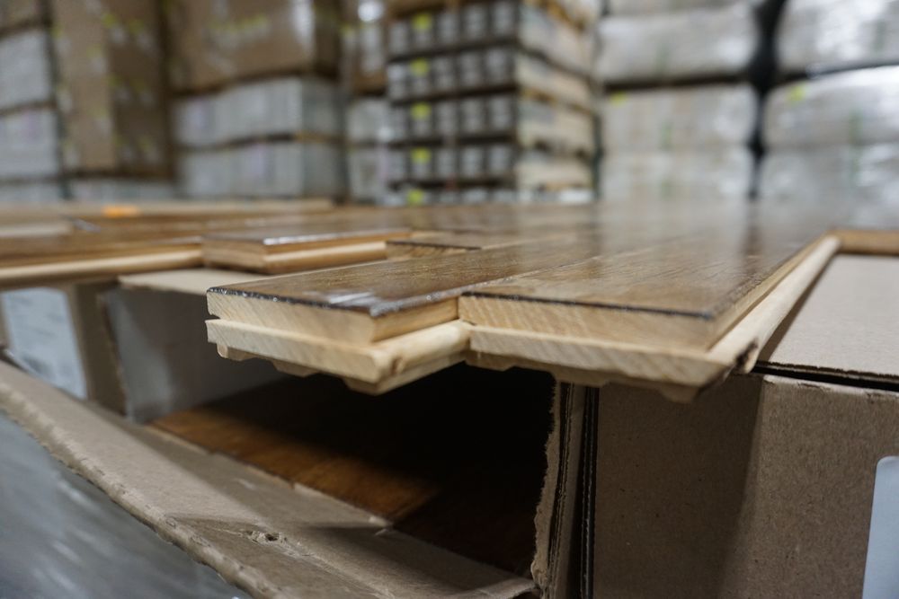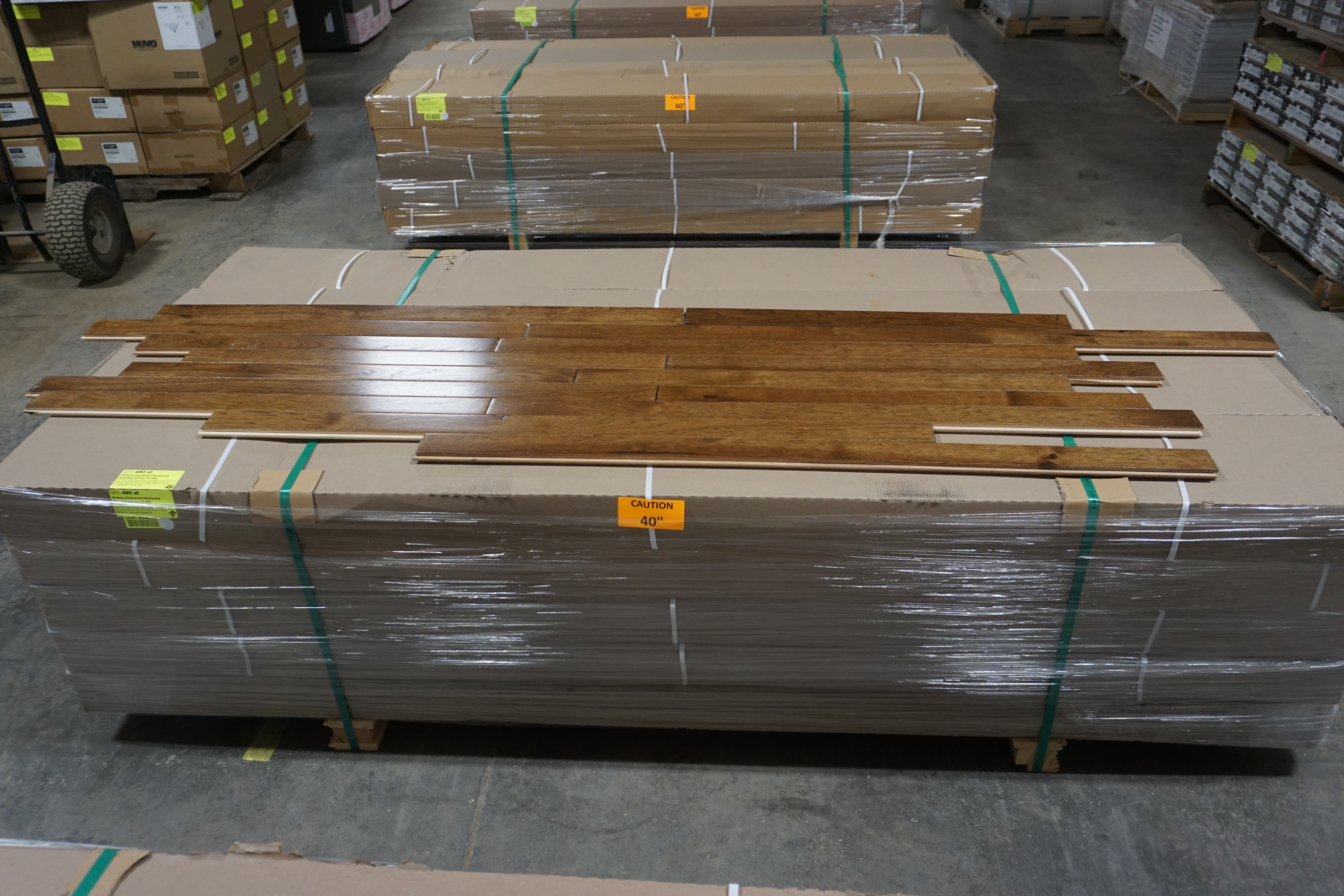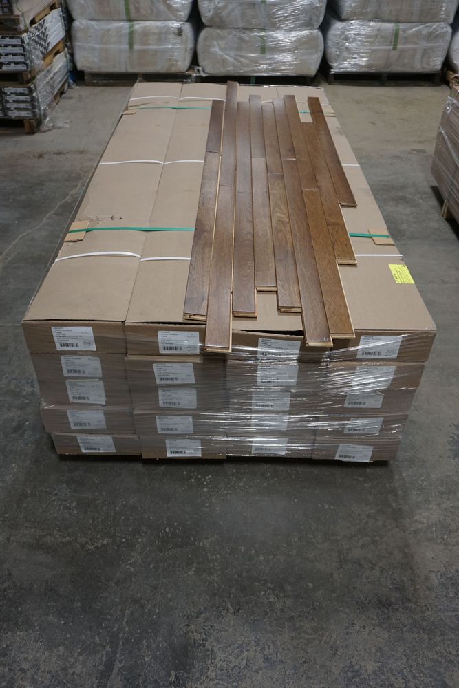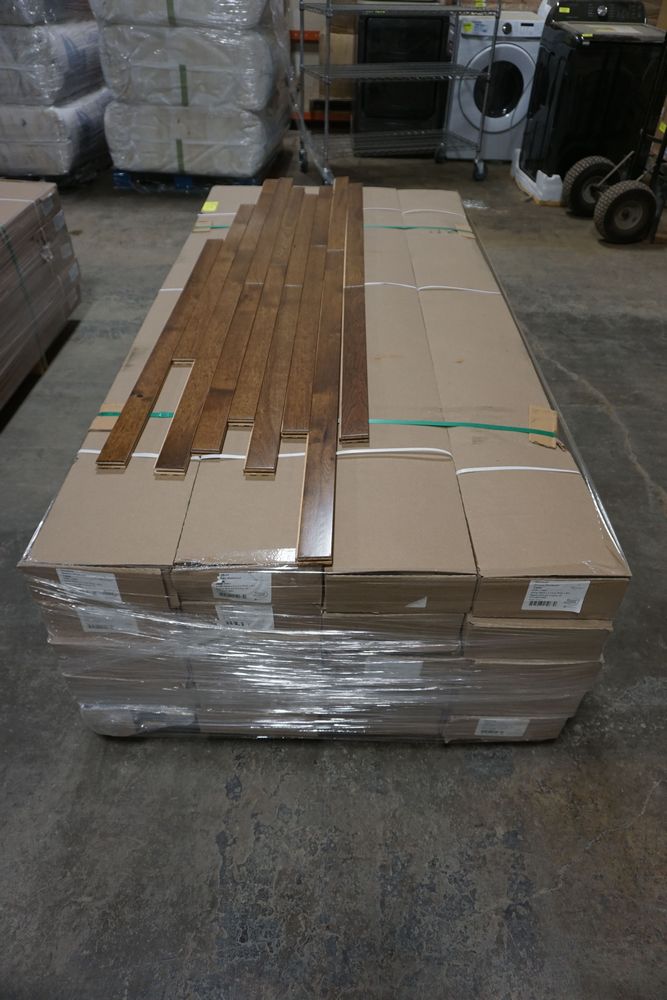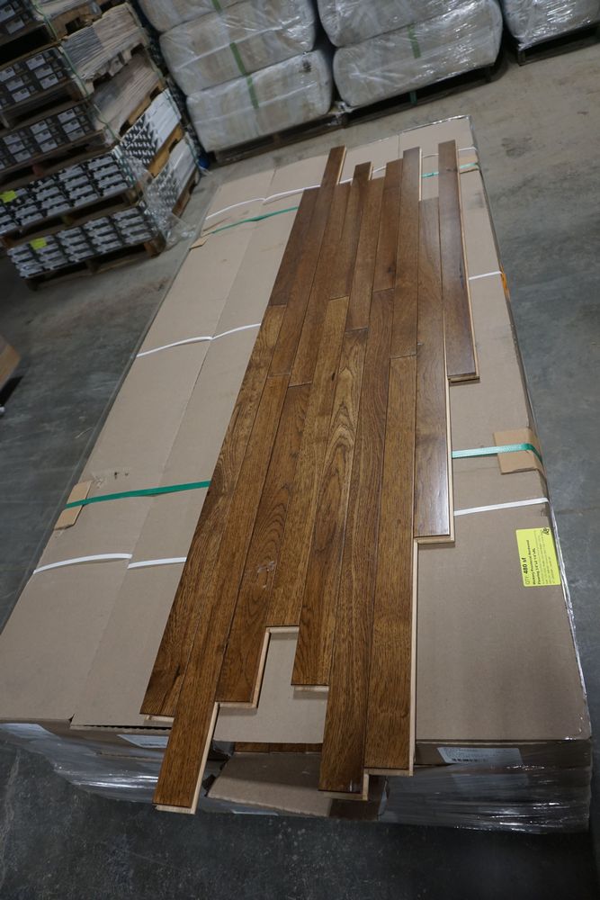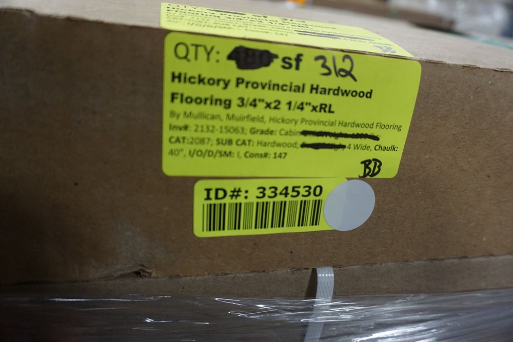 Hickory Provincial Hardwood Flooring 3/4"x 2 1/4"x RL *SEE DESCRIPTION*. By Mullican, Muirfield, Hickory Provincial Hardwood Flooring. Grade Cabin. 13 Boxes. *Please pay attention to photos. There is some damage to boxes and a few pieces of flooring.* Chalk marks are from manufacturer and can be wiped off. Cabin/Utility/Tavern Grade: This flooring product will have varying wood characteristics and colors to include streaks, deeper knots and burls, small splits, wormholes, and even marks during the milling process such as machine burns. It may also have a large variance in color and grain patterns. The boards are typically 10” to 30” with an average board length of 16”. It is usually packaged in mini bundles of 18-20 sf per bundle. It is ok for 5” wide to be heavier in shorter pieces. Cabin grade is a stable, installable product but please account up to 10%-20% waste. *Any manufacturer warranties are NOT VALID with any purchase at our Auctions unless stated otherwise.. Weight: X. Sold by: Square Foot. Sold as: Quantity x Price.