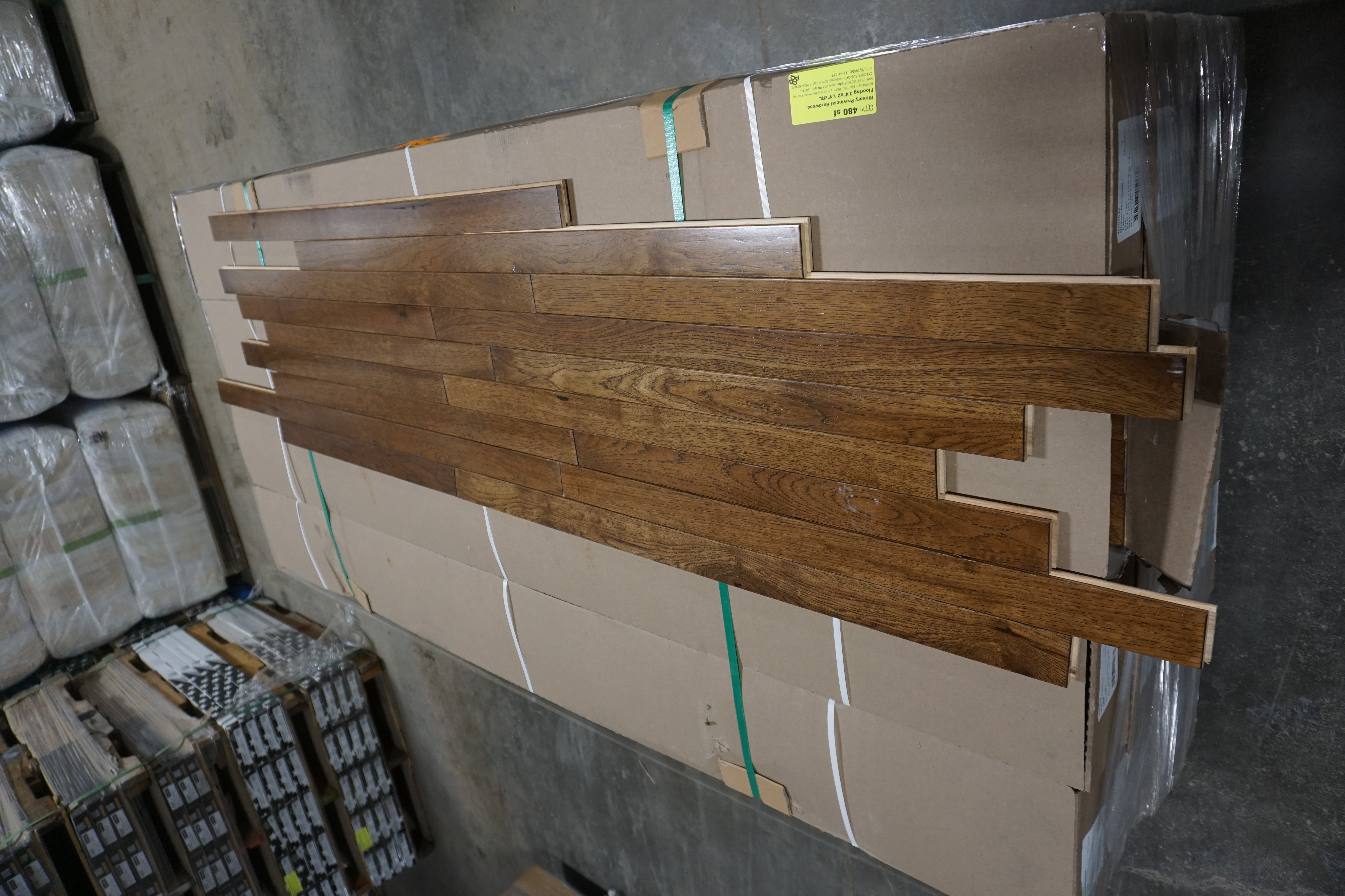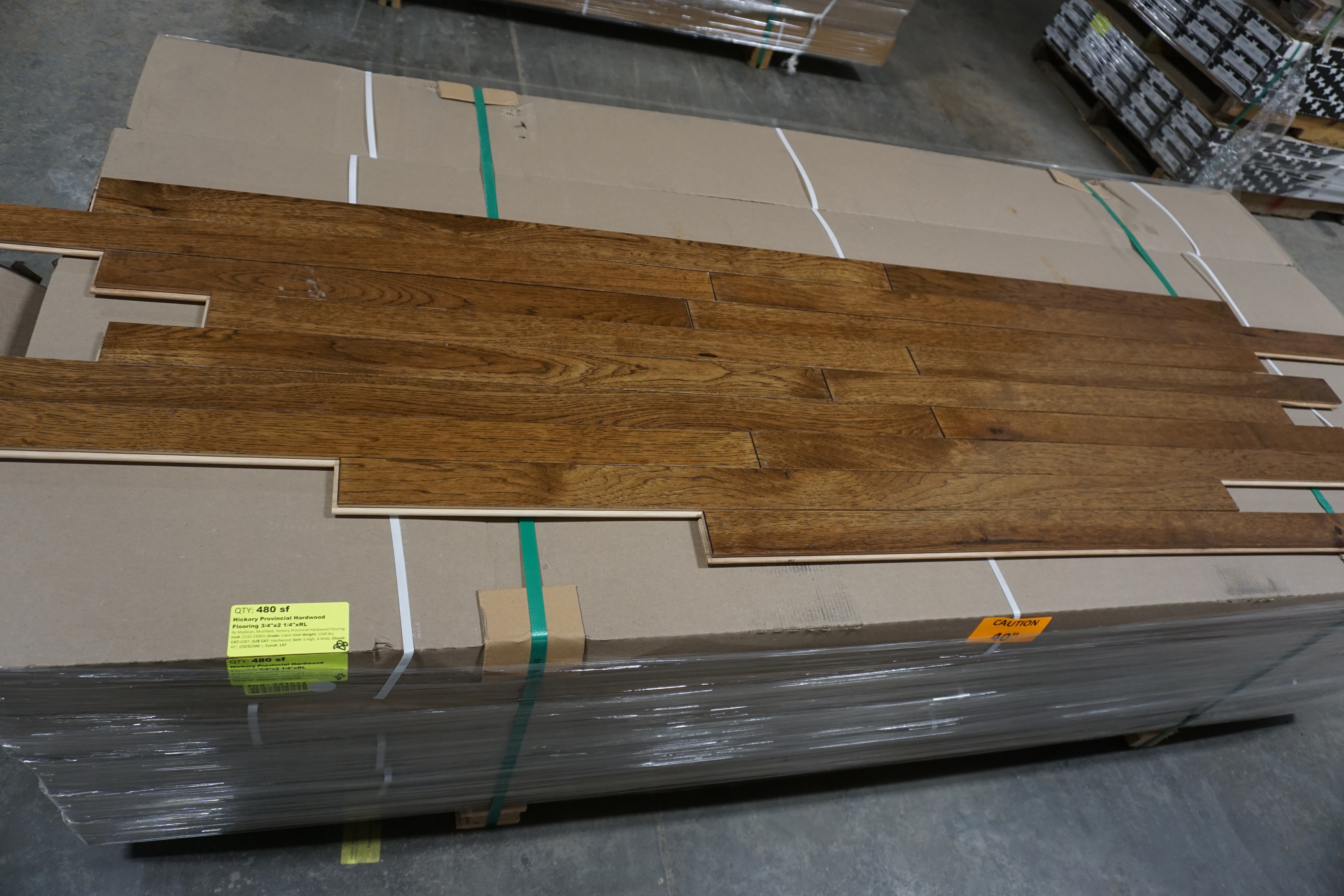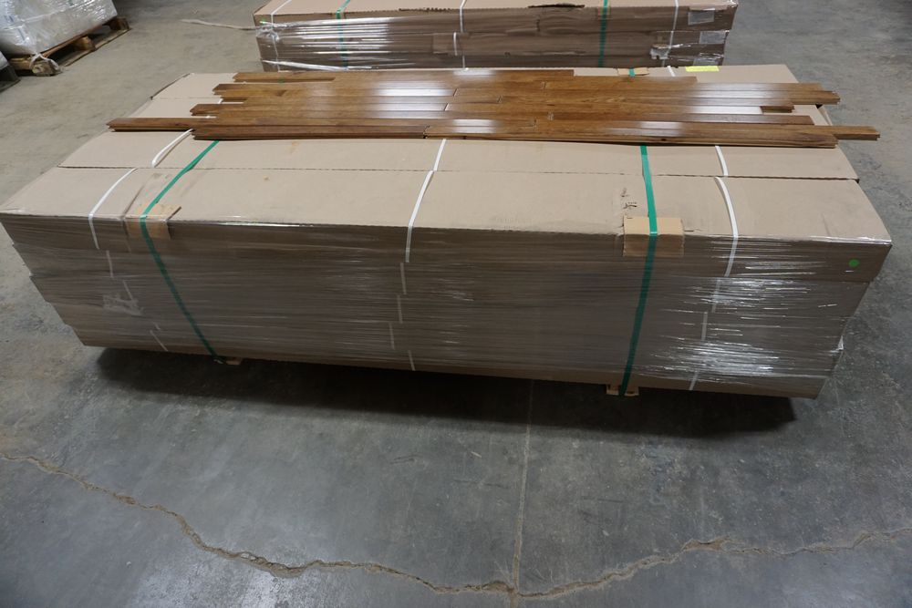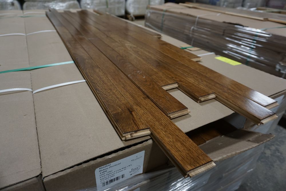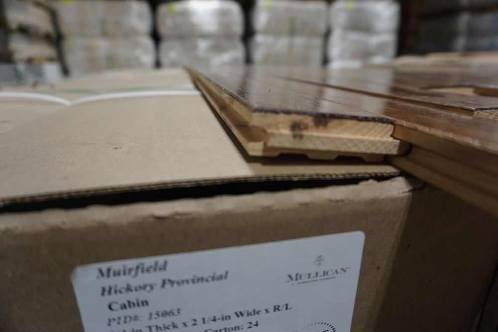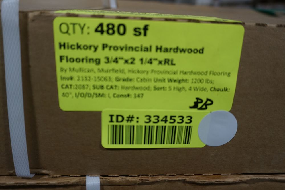 Hickory Provincial Hardwood Flooring 3/4"x 2 1/4"x RL. By Mullican, Muirfield, Hickory Provincial Hardwood Flooring. Grade Cabin. 20 Boxes. Chalk marks are from manufacturer and can be wiped off. Cabin/Utility/Tavern Grade: This flooring product will have varying wood characteristics and colors to include streaks, deeper knots and burls, small splits, wormholes, and even marks during the milling process such as machine burns. It may also have a large variance in color and grain patterns. The boards are typically 10” to 30” with an average board length of 16”. It is usually packaged in mini bundles of 18-20 sf per bundle. It is ok for 5” wide to be heavier in shorter pieces. Cabin grade is a stable, installable product but please account up to 10%-20% waste. *Any manufacturer warranties are NOT VALID with any purchase at our Auctions unless stated otherwise.. Weight: 1200 lbs. Sold by: Square Foot. Sold as: Quantity x Price.