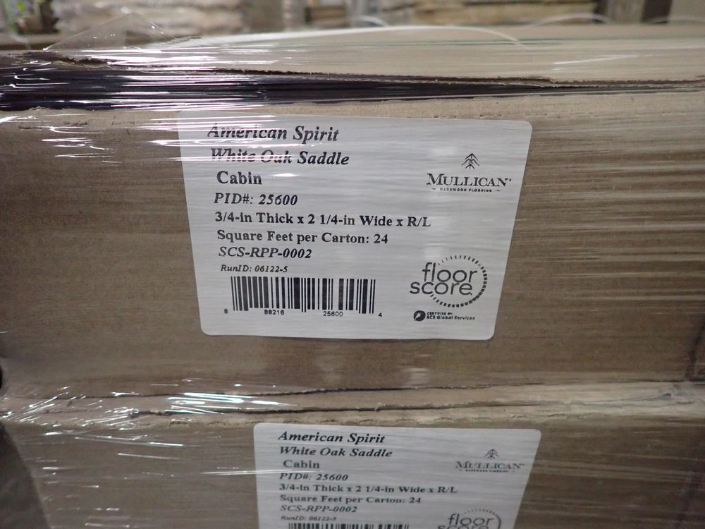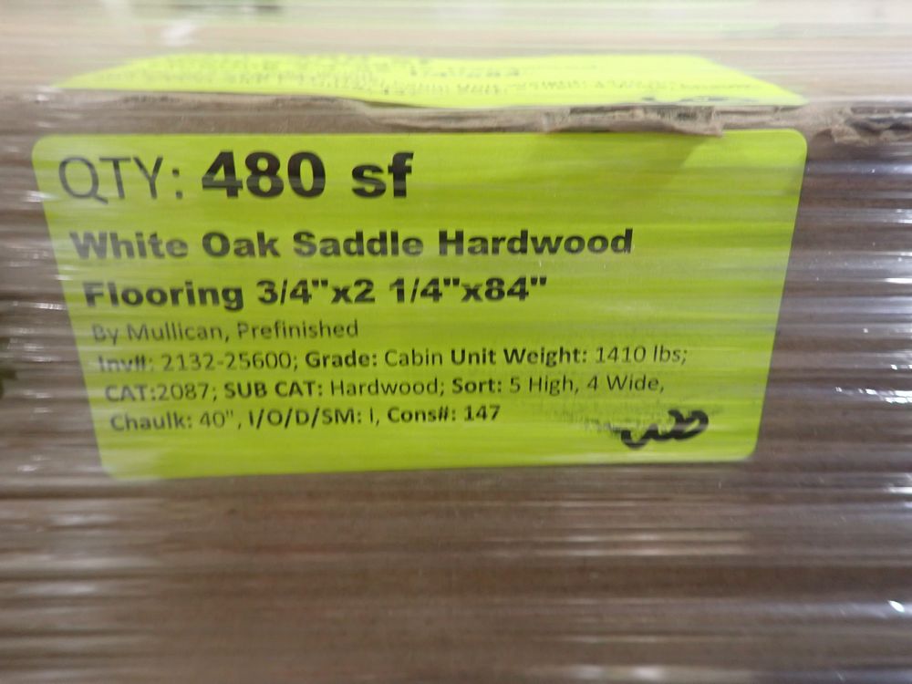 White Oak Saddle Hardwood Flooring 3/4" x 2 1/4" x 84". By: Mullican, Prefinished, Grade: Cabin. There are 20 boxes in this lot. *Any manufacturer warranties are NOT VALID with any purchase at our Auctions unless stated otherwise.. Weight: 1410. Sold by: Square Foot. Sold as: Quantity x Price.