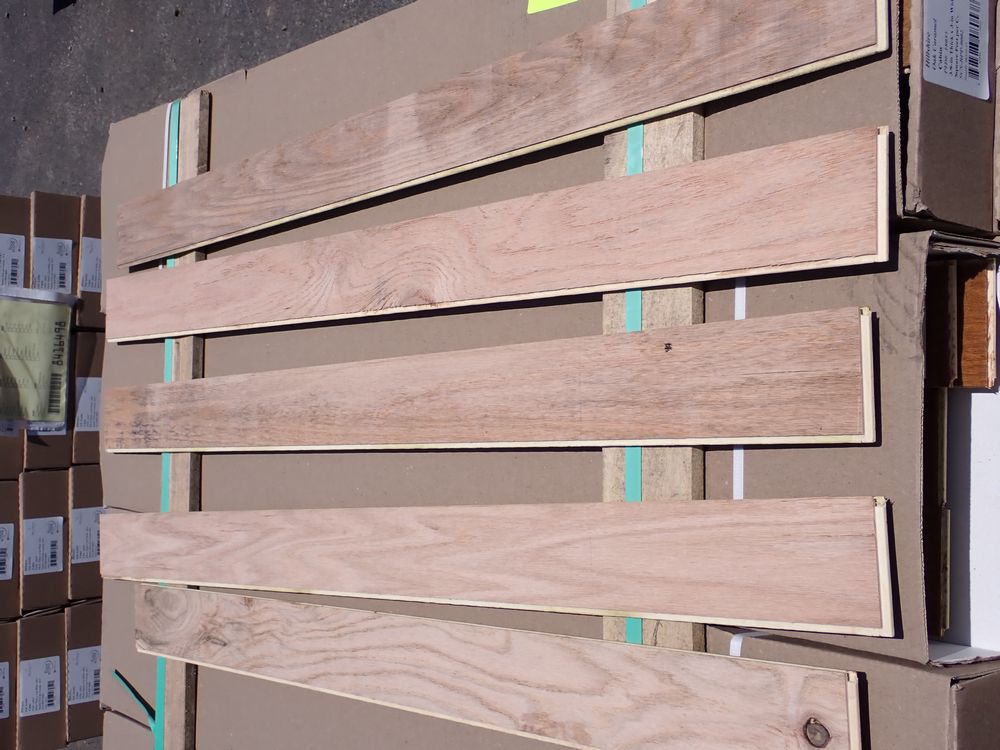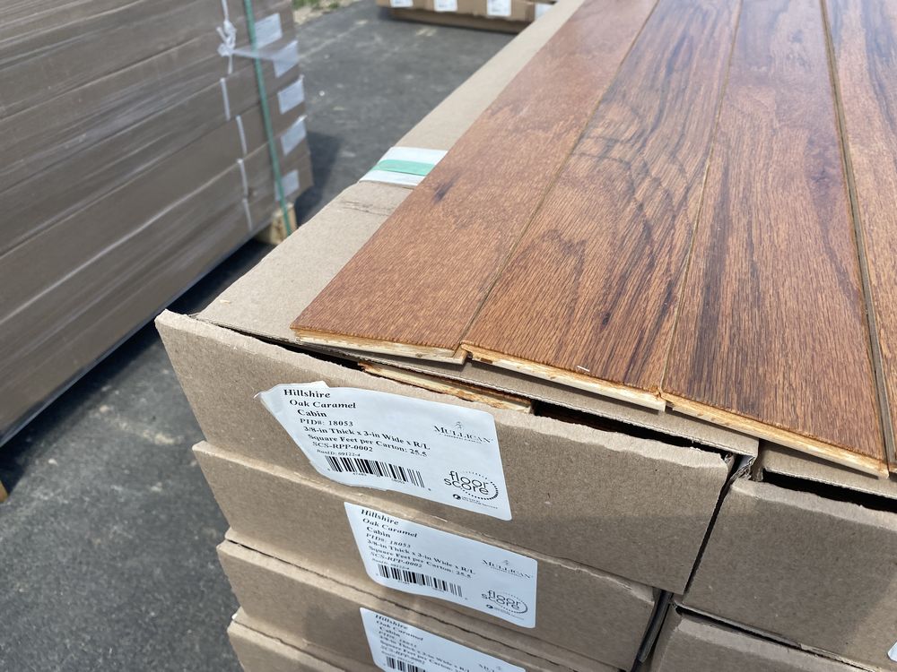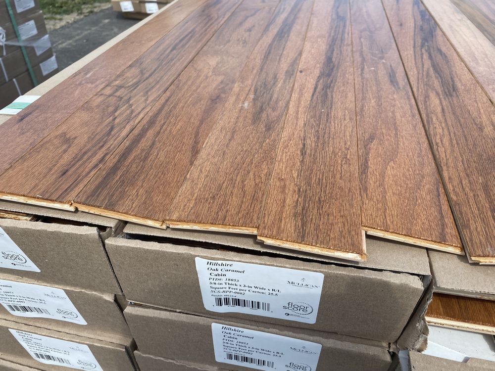 Oak Caramel Engineered Hardwood Flooring 3/8" x 3" x RL. By Mullican, Prefinished, Grade: Cabin. Chalk marks are from manufacturer and can be wiped off. 16 Boxes. Cabin/Utility/Tavern Grade: This flooring product will have varying wood characteristics and colors to include streaks, deeper knots and burls, small splits, wormholes, and even marks during the milling process such as machine burns. It may also have a large variance in color and grain patterns. The boards are typically 10” to 30” with an average board length of 16”. It is usually packaged in mini bundles of 18-20 sf per bundle. It is ok for 5” wide to be heavier in shorter pieces. Cabin grade is a stable, installable product but please account up to 10%-20% waste. Please refer to the Documents tab under this product for additional hardwood flooring information. *Any manufacturer warranties are NOT VALID with any purchase at our Auctions unless stated otherwise.. Weight: 910. Sold by: Square Foot. Sold as: Quantity x Price.