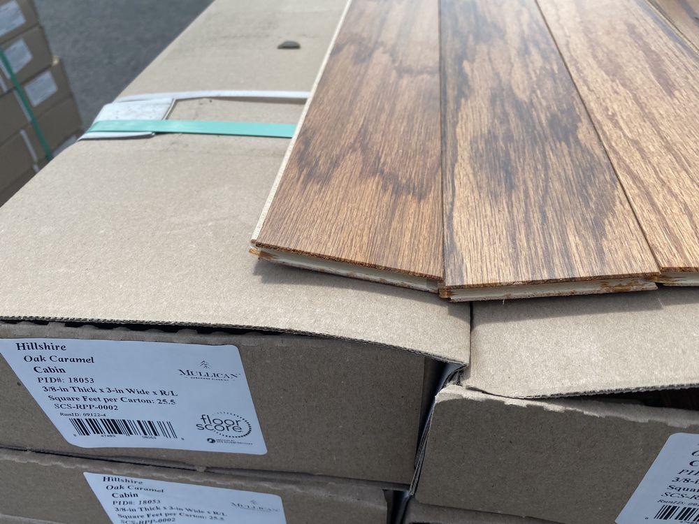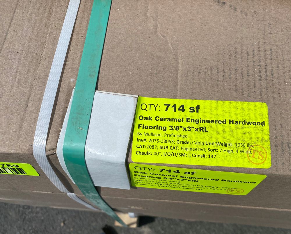 Oak Caramel Engineered Hardwood Flooring 3/8" x 3" x RL. 16 Boxes, 25.5 SF Per Box, By: Mullican, Prefinished, Grade: Cabin. Chalk marks are from manufacturer and can be wiped off. Cabin/Utility/Tavern Grade: This flooring product will have varying wood characteristics and colors to include streaks, deeper k *Any manufacturer warranties are NOT VALID with any purchase at our Auctions unless stated otherwise.. Weight: 910. Sold by: Square Foot. Sold as: Quantity x Price.