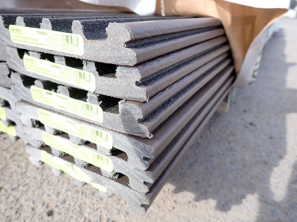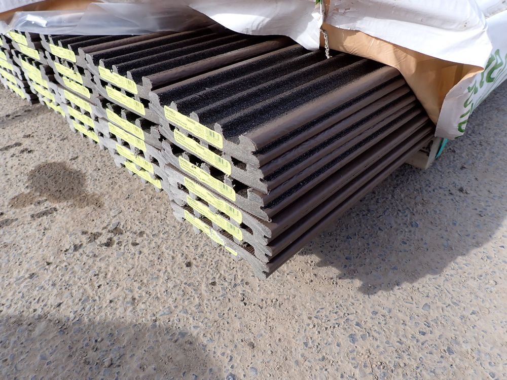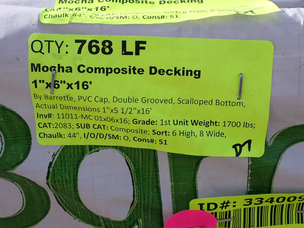 Mocha Composite Decking 1" x 6" x 16'. By Barrette, PVC Cap, Double Grooved, Scalloped Bottom, Actual Dimensions 1" x 5 1/2" x 16'. Grade 1st Quality. 48 Pieces. *Any manufacturer warranties are NOT VALID with any purchase at our Auctions unless stated otherwise.. Weight: 1700 pounds. Sold by: Linear Foot. Sold as: Quantity x Price.
