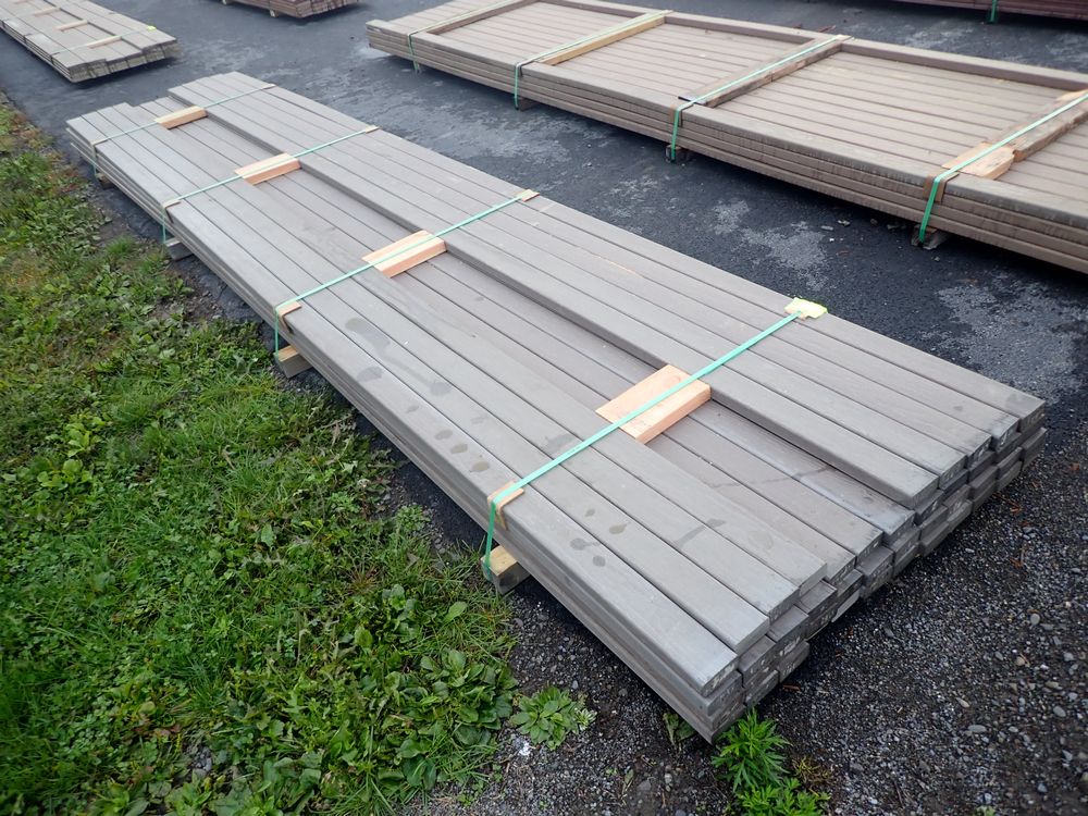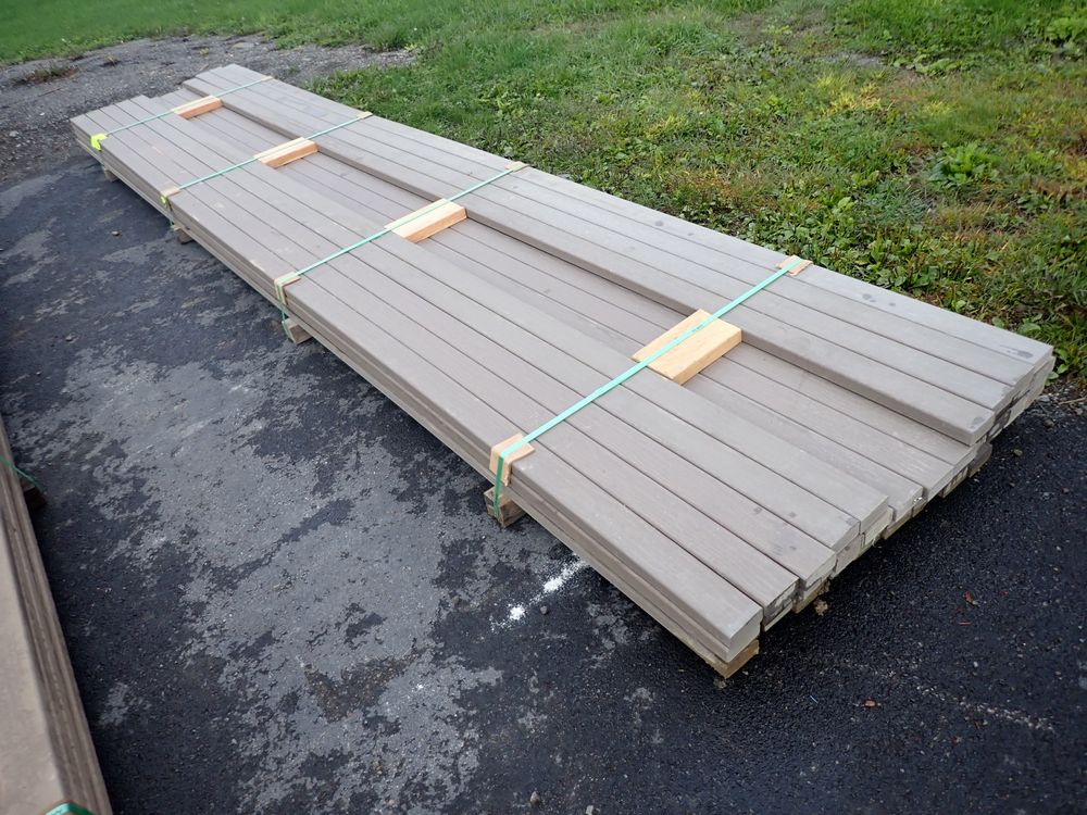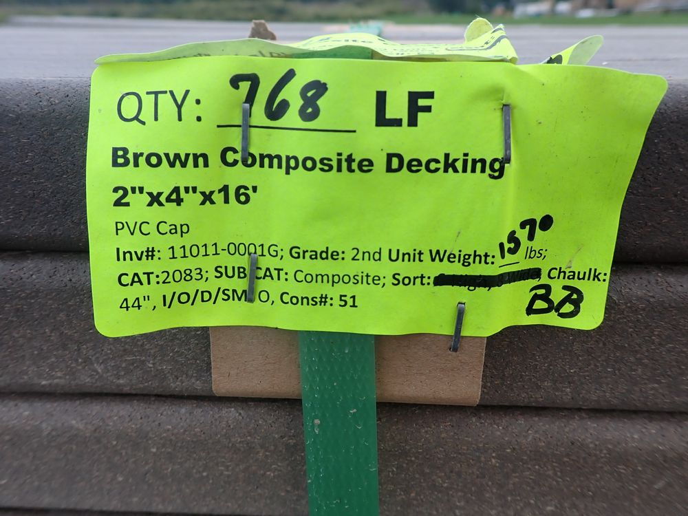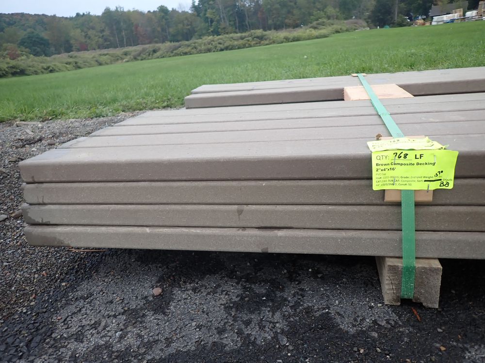 Brown Composite Decking 2" x 4" x16'. PVC Cap. Square End. Grade: 2nd. 45 boards. *Any manufacturer warranties are NOT VALID with any purchase at our Auctions unless stated otherwise.. Weight: 1370. Sold by: Linear Foot. Sold as: Quantity x Price.