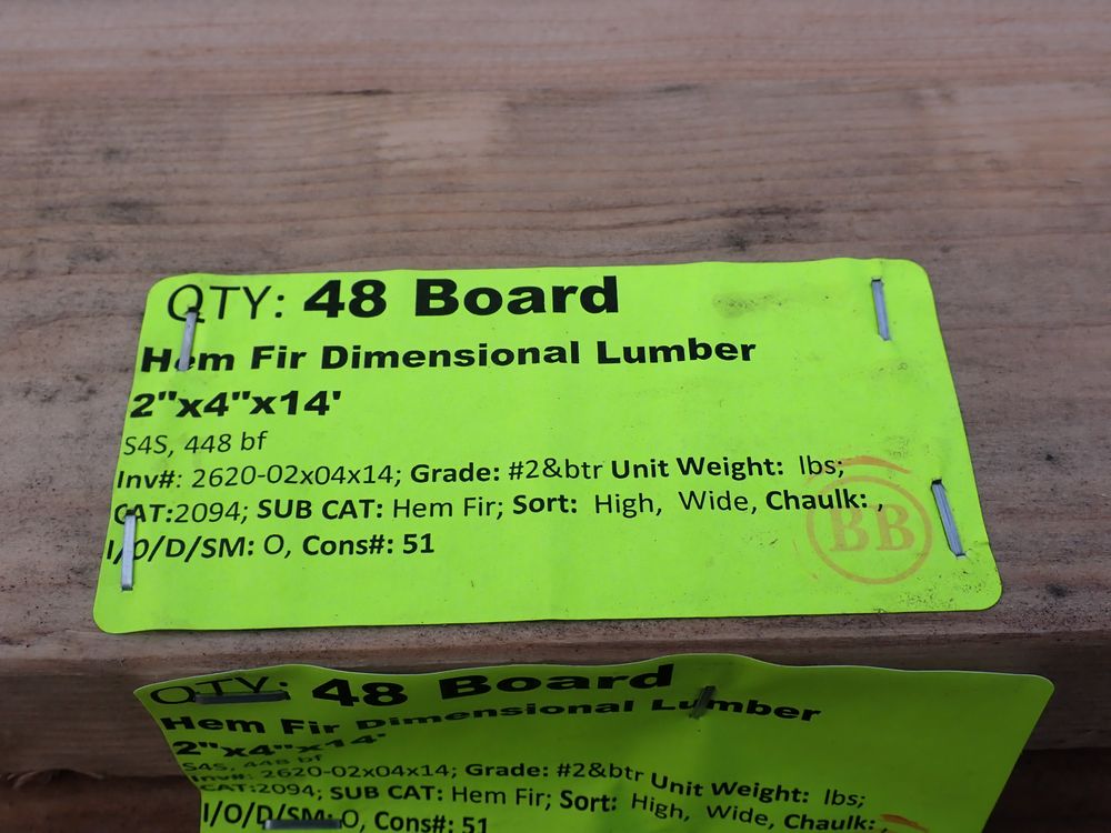 Hem Fir Dimensional Lumber 2" x 4" x 14'. S4S, 448 bf. Grade #2&btr *Any manufacturer warranties are NOT VALID with any purchase at our Auctions unless stated otherwise.. Weight: X. Sold by: Board. Sold as: Quantity x Price.