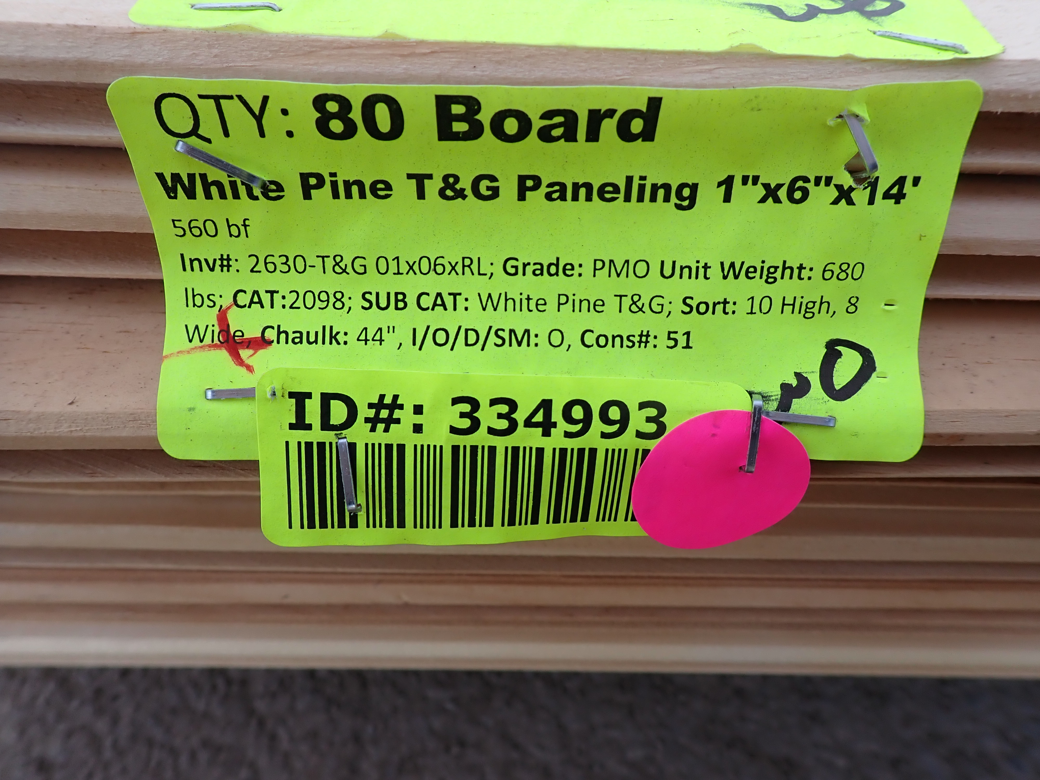 White Pine T&G Paneling 1" x 6" x 14'. 560 bf, Grade: PMO Face Side Has All Edge And Center Bead, Back Of Board Profile Varies *Any manufacturer warranties are NOT VALID with any purchase at our Auctions unless stated otherwise.. Weight: 680. Sold by: Board. Sold as: Quantity x Price.