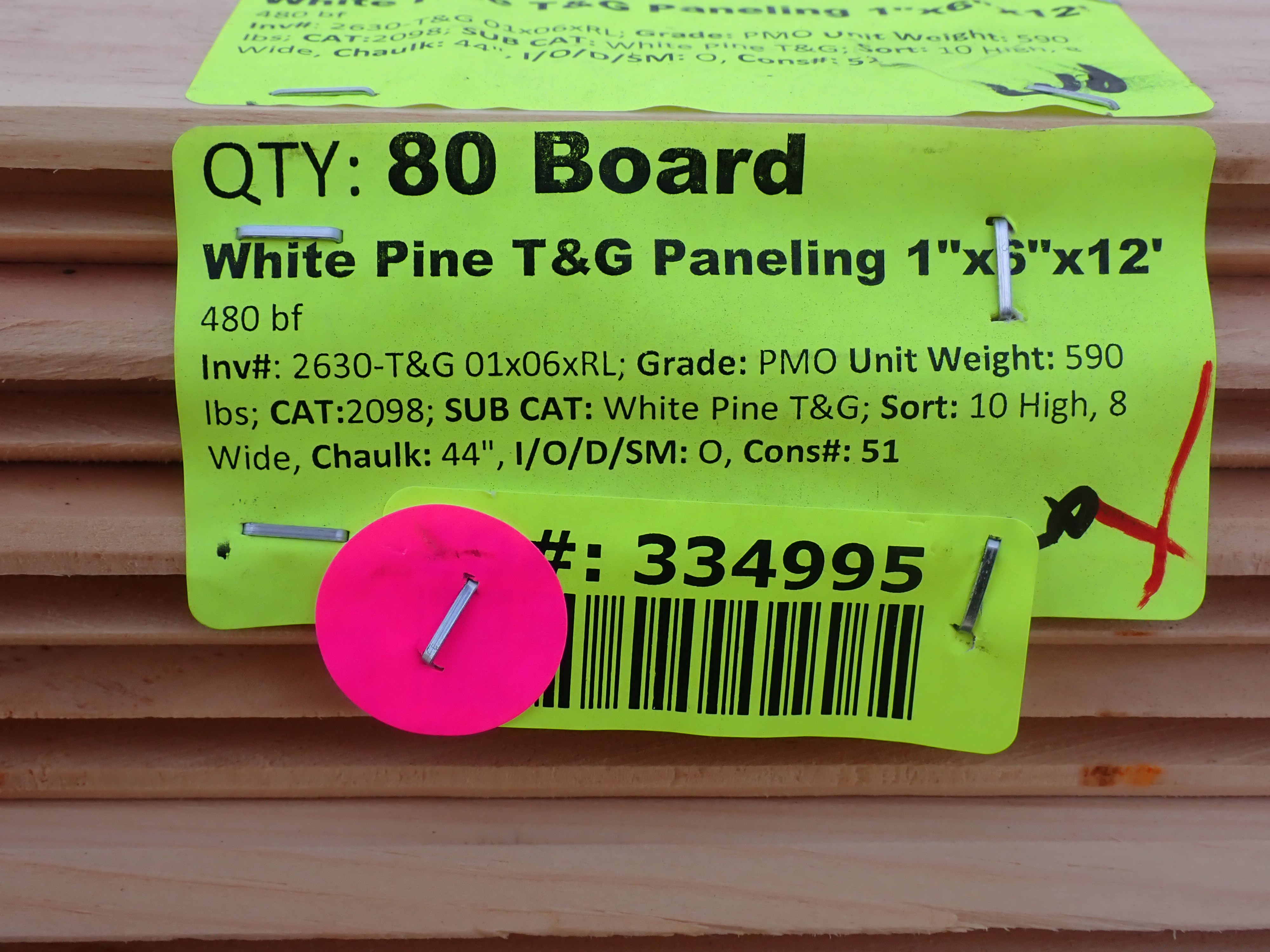 White Pine T&G Paneling 1" x 6" 12'. 480 bf, Grade: PMO Face Side Has All Edge And Center Bead, Back Of Board Profile Varies *Any manufacturer warranties are NOT VALID with any purchase at our Auctions unless stated otherwise.. Weight: 590. Sold by: Board. Sold as: Quantity x Price.